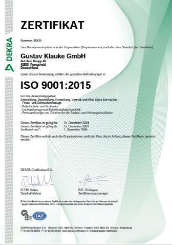 Certifikované systémy řízení kvality společnosti Klauke - ISO 9001:2015 - systém řízení kvality s orientací na zákazníka a procesy.