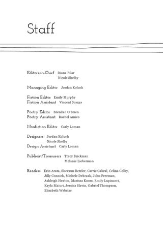 Managing Editor Jordan Koluch Fiction Editor Emily Murphy Fiction Assistant Vincent Scarpa Poetry Editor Brendan O’Brien Poetry Assistant Rachel Amico Nonfiction Editor Carly Loman Designers Jordan Koluch Nicole Shelby