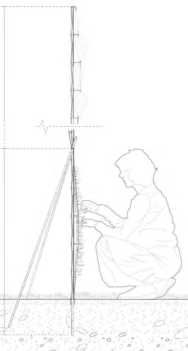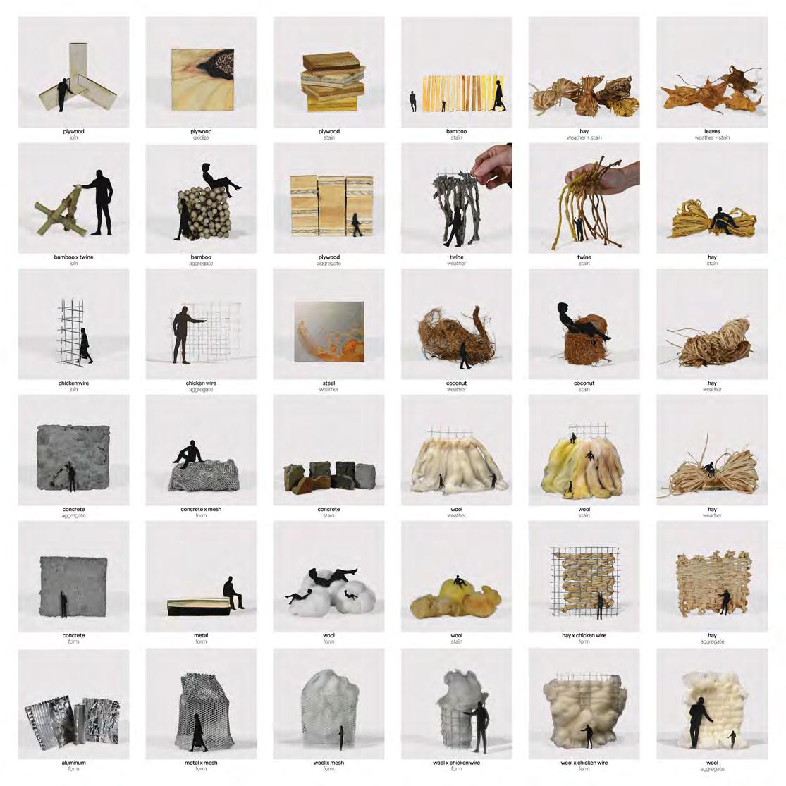Experimentations with a range of materials revealed their sensory qualities (ie. uninviting nature of concrete; comforting haptics of wool) which inspired the material selection for the case study. Selecting two on opposite ends of the spectrum (wheatgrass and plastic shipping packages) responds to the subjective nature of comfort. Further explorations of materials interactions unveiled weaving as a simple methods for construction.