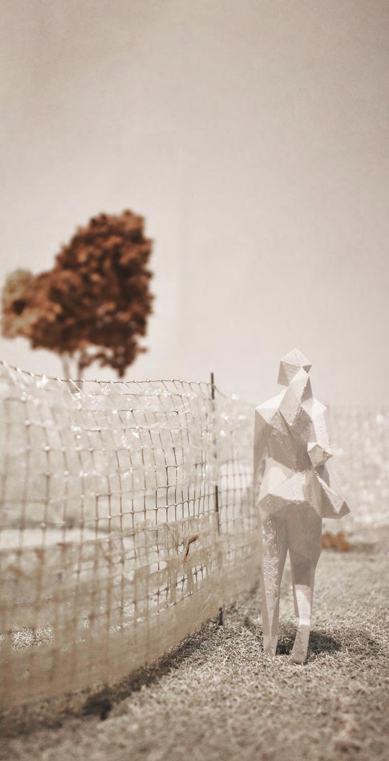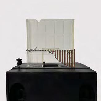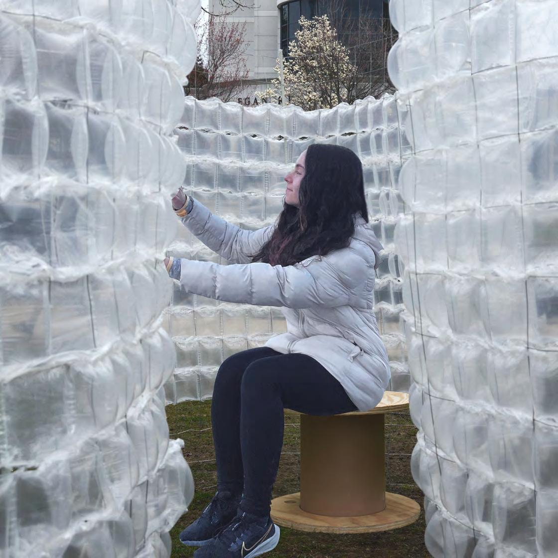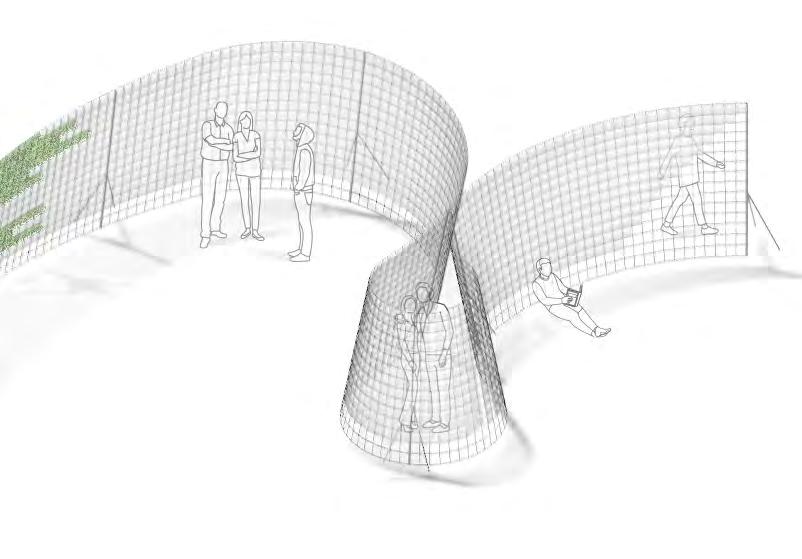 The plastic enclosure ofers a diferent experience of space and place through the distortion of light. Its transparency instills a bufer between users and the chaotic campus, and invites moments of haptic curiosity.