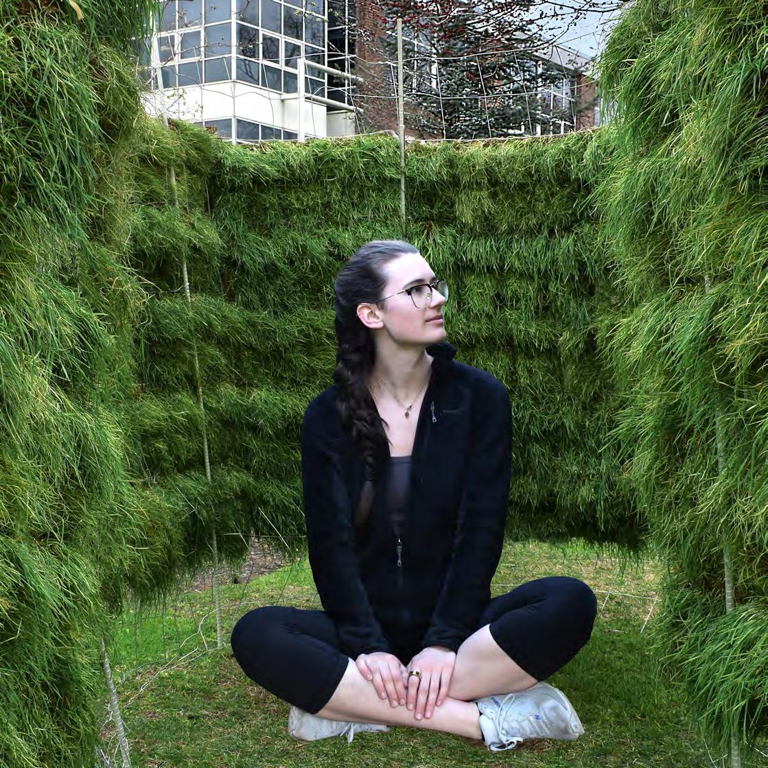 The use of natural materials like grass stimulate serotonin and dopamine production to counteract the “fight or flight” response. Within the grass enclosure, the dramatic proximity to nature exploits our innate neurological reaction to biophilia. This sensory immersion counteracts the anxious college environment.
