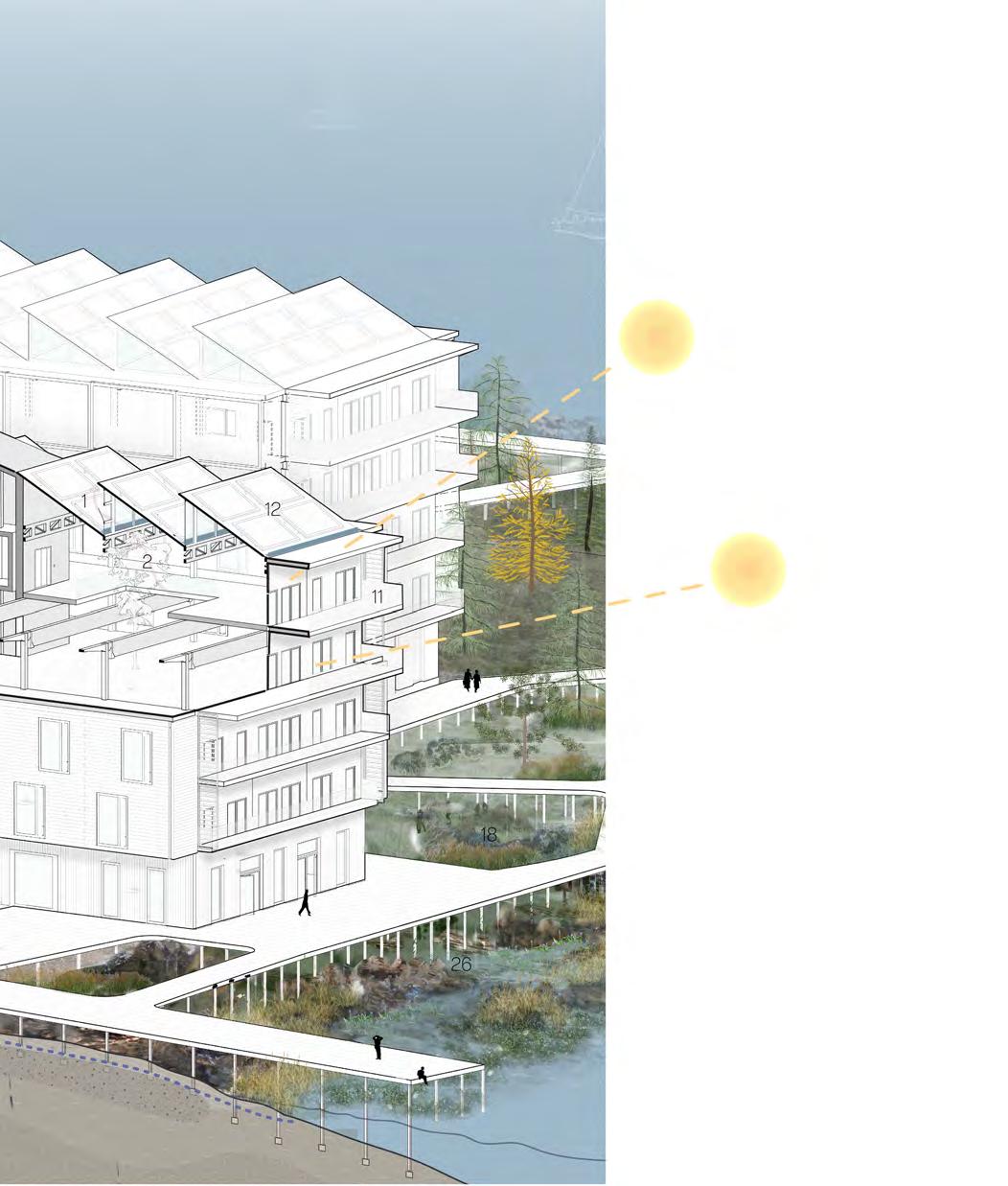 The site features various public and community amenities intended to foster engagement, reveal the changing landscape and protect the community. Bufered by the raised waterfront, the residential units are organized around pedestrian pathways, shared neighborhood gardens and playgrounds protected from the busy roads.