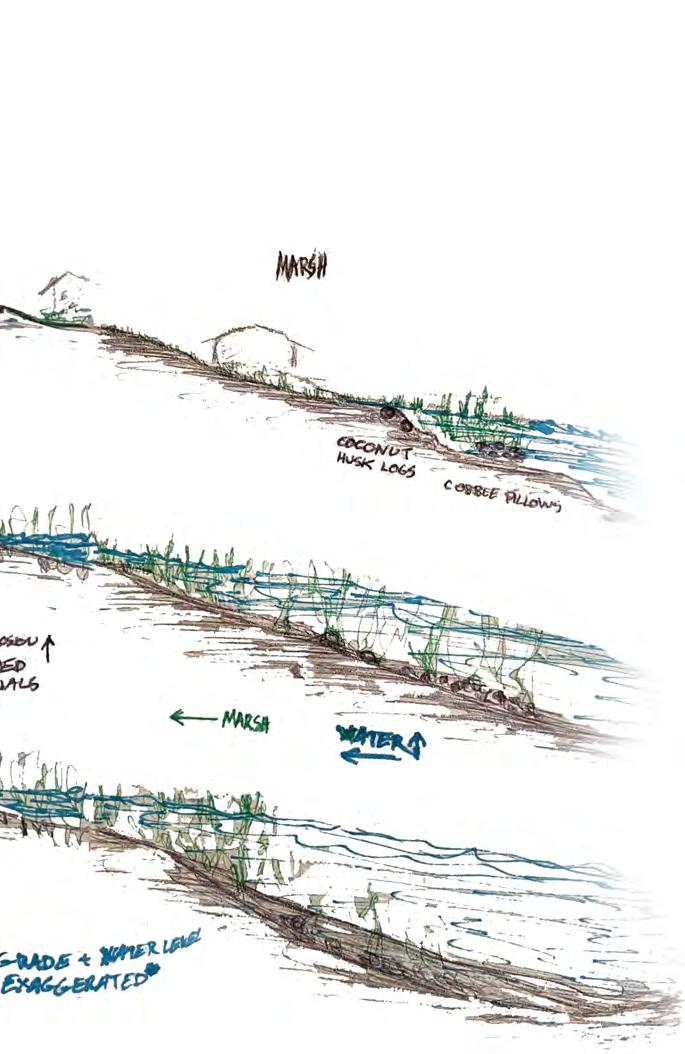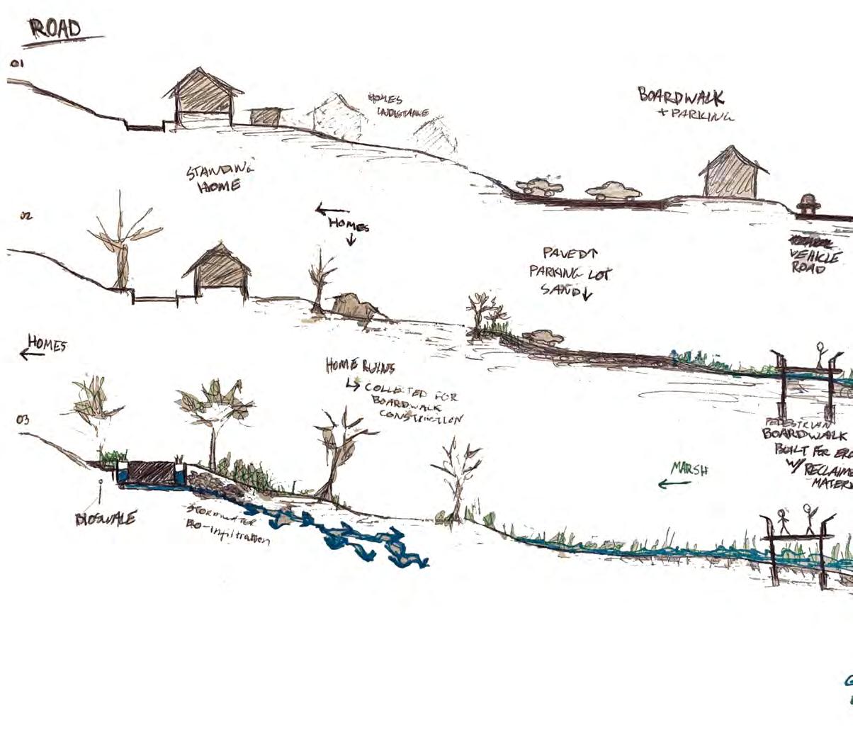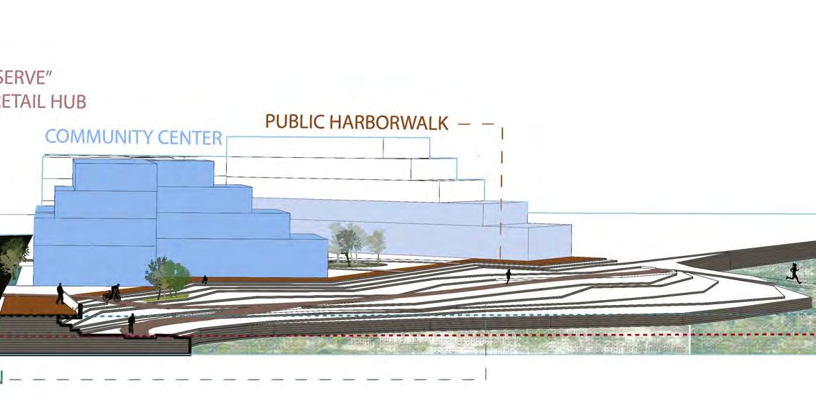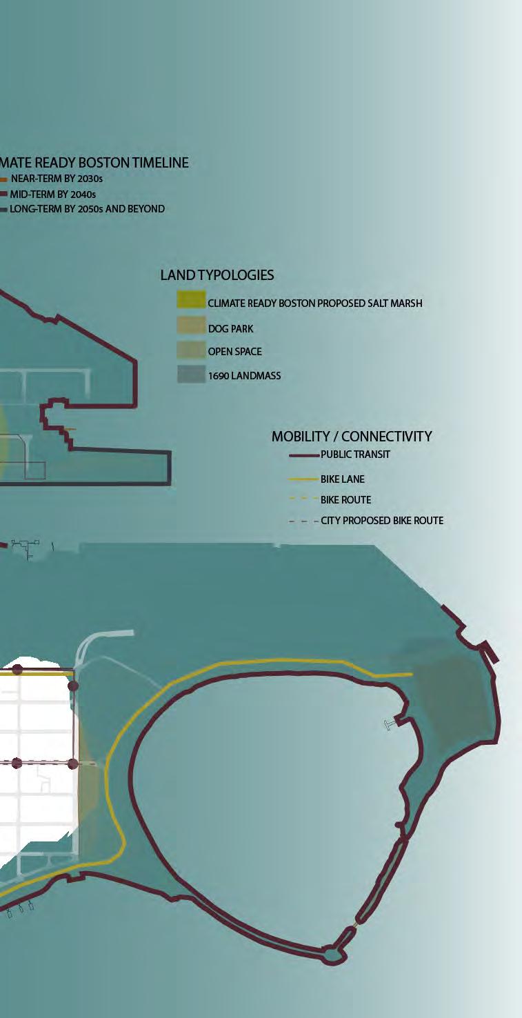 “The Reserve” transforms climate ready Boston’s proposed monofunctional salt marsh waterfront into a multifunctional waterfront. Featuring retail space on elevated topography as a barrier to mitigates sea level rise, providing recreation and access to the water.
