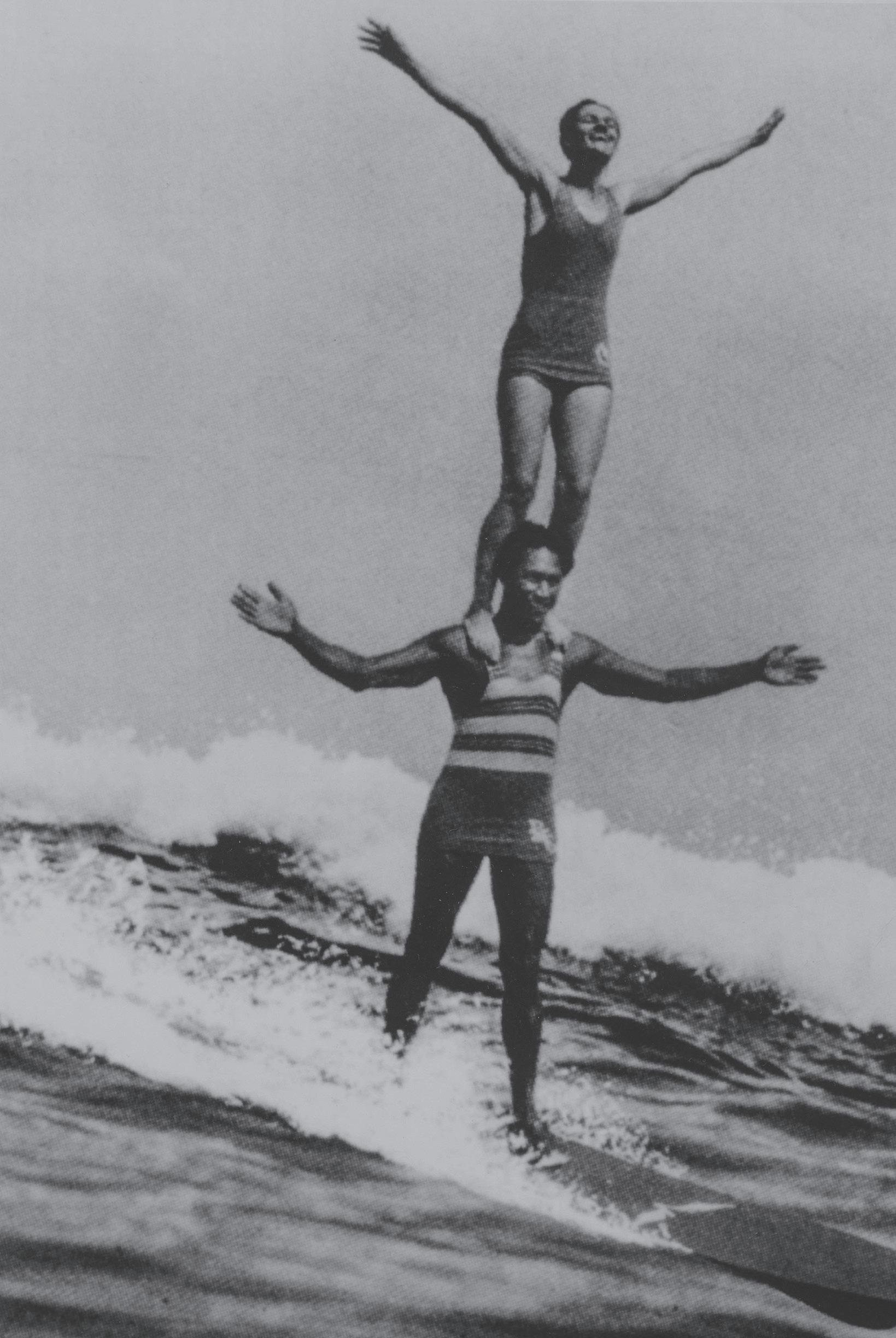 Duke Kahanamoku surfing tandem with Viola Hartman, in 1922, California, US.