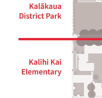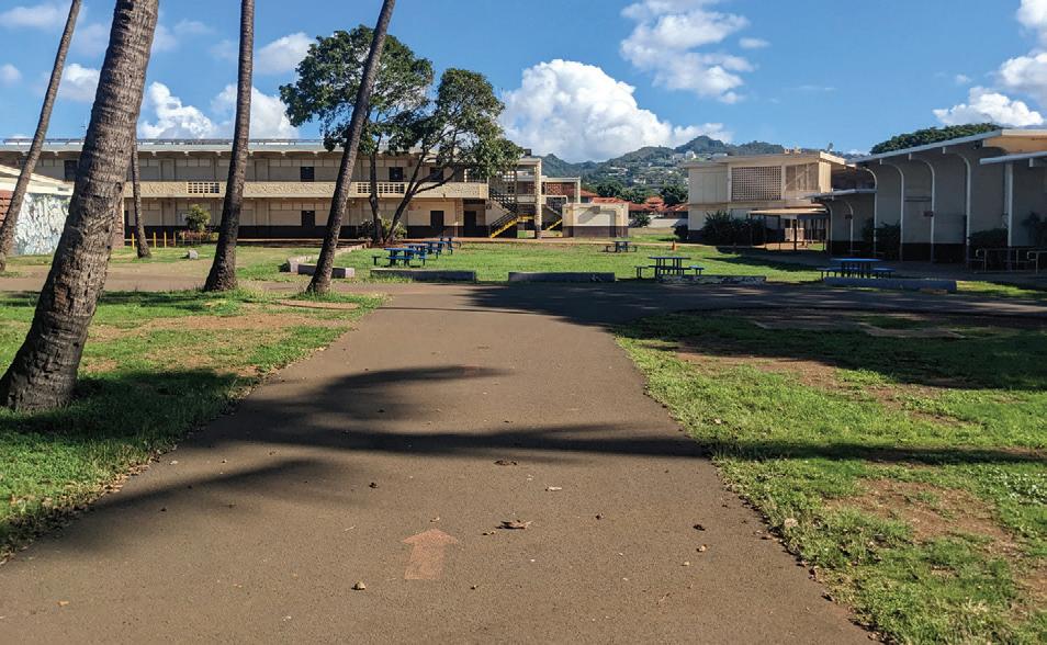 There are few interesting play features at the existing site. A lack of tra c calming measures has le one of the main roads leading to the schools with a high tra c accident rate. Many of the playgrounds are unshaded, isolated from each other, and located on small islands of safety surfacing. They do not blend well with the local and cultural context, and the materials used in these largely pre-fabricated playgrounds do not hold up in Hawai‘i’s hot and humid climate. Repairs can be costly, especially due to Hawai‘i’s isolation from the mainland, where inspectors and repair professionals are located. The site is surrounded by single family and apartment residential zones, including public housing, and industrial mixed-use business areas.