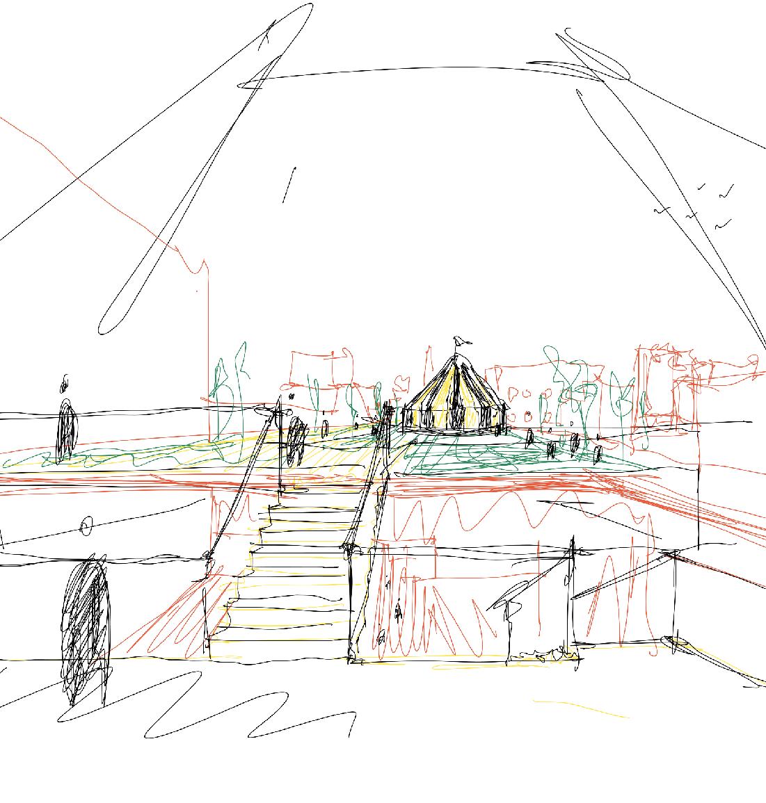 Con un marco de acero tensado y tela blanca ligera, crea una pantalla capaz de recibir proyecciones, creando una atmósfera inmersiva de imágenes, sonidos, olores y temperatura variables. Es un lugar de animaciones y lugares de interacción con un marcado carácter escénico.