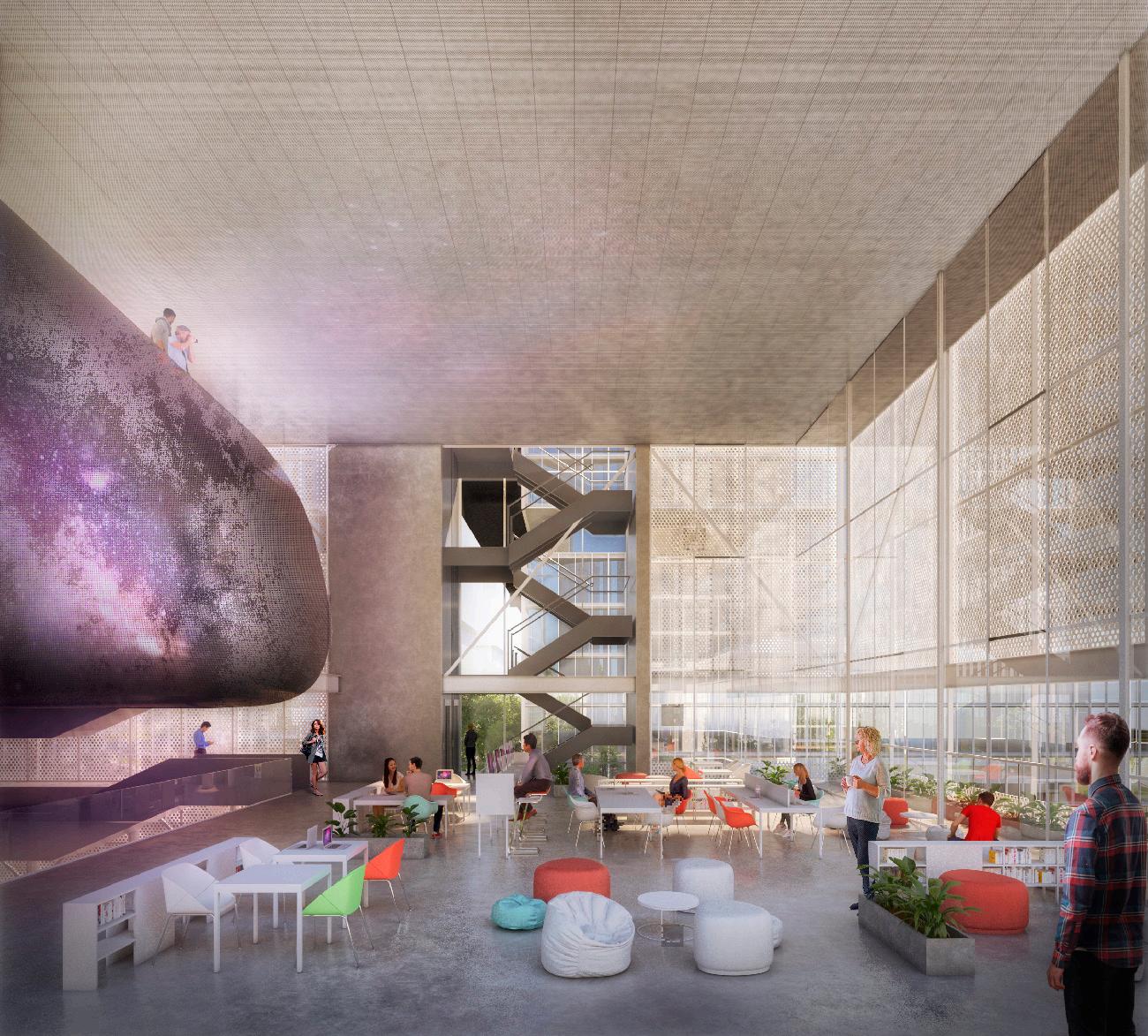 Al mismo tiempo, es un escenario para ver y experimentar la naturaleza y las culturas, tanto del pasado como del futuro. El programa de exhibición y servicio está contenido en un bloque de acero suspendido sobre la plaza de agua. En el área principal de exhibición, una ventana alargada brinda al visitante una nueva perspectiva del pabellón y las proyecciones. Debajo de este bloque, un restaurante y una tienda tienen lugar en una plataforma pavimentada con una vista de 360 grados del pabellón. El enfoque es preservar y promover la naturaleza y la sostenibilidad a través de la tecnología.