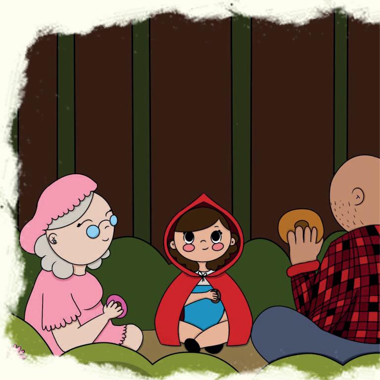 No fim, a vovó, Chapeuzinho e o lenhador sentaram para comer os deliciosos docinhos que a mamãe havia feito.