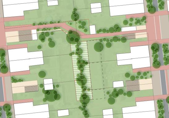 A common space in the heart of the block is also a source of nuisance. It is returned to the adjacent gardens by preserving the alley linking the two streets. Finally, the vegetation enhances the architectural rhythm of the city while allowing the buffer of rainwater that the undersized underground network cannot absorb in case of heavy rainfall.