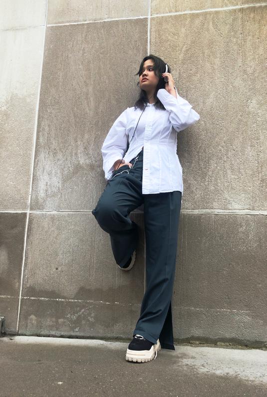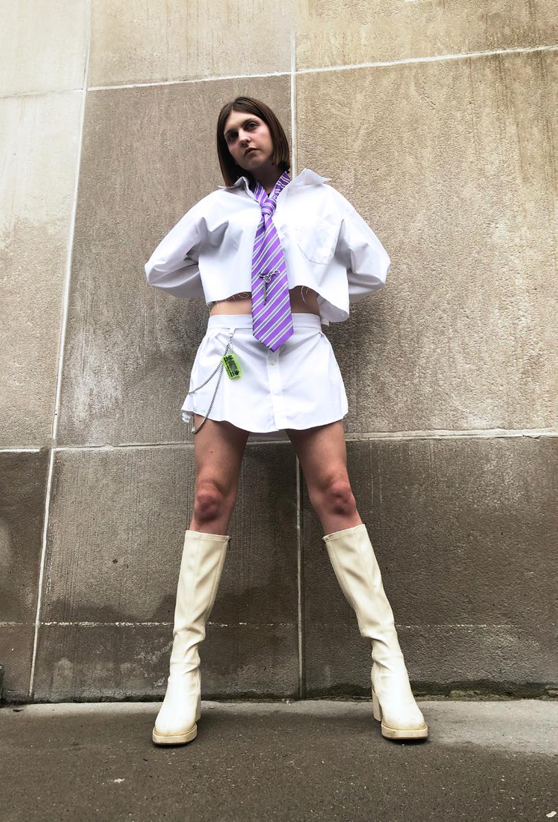 The Victoria College Environmental Fashion Show held at the University of Toronto challenges designers to create garments by repurposing used materials. Under the theme in-sync/ out-of-touch, the collection reconfigures the traditional office uniform from the lens of dystopian fiction. Drawing inspiration from 90s dystopian office movies like The Matrix and Johnny Mnemonic, the clothing pushes back against corporate uniformity by priviledg the self-made, imperfect and unfinished. Sustainable fashion creates a space for makers to propose alternatives to the antagonist that is the contemporary fashion industry, and this collection hopes to empower viewers to experiment and create something new using mundane materials.