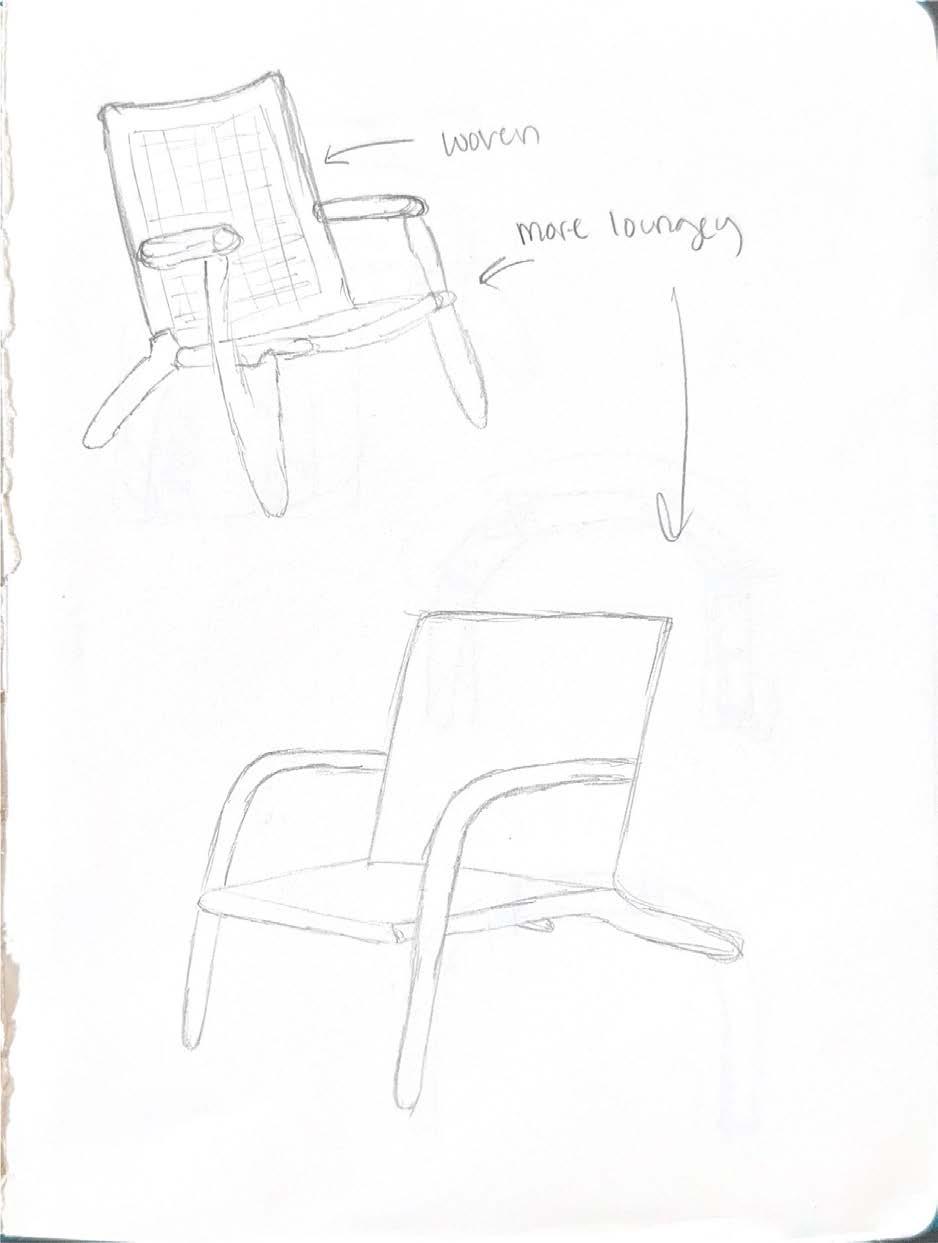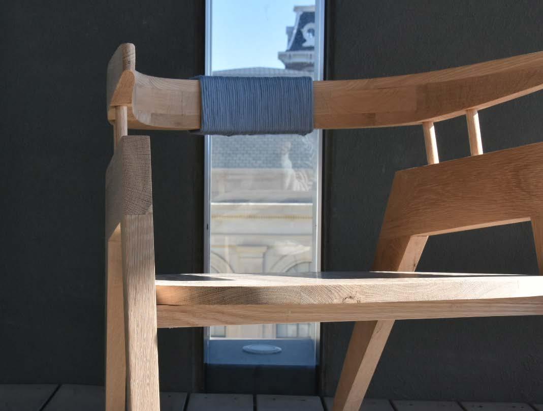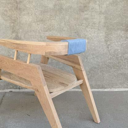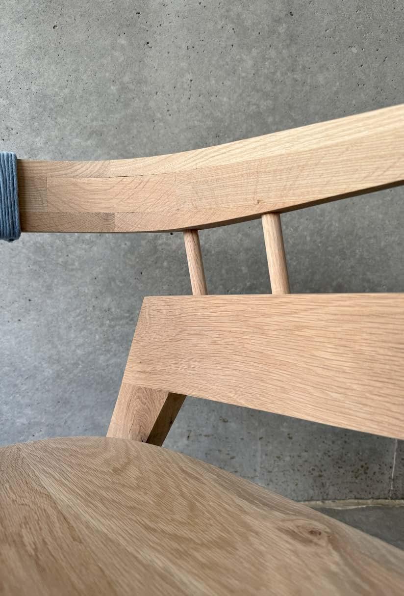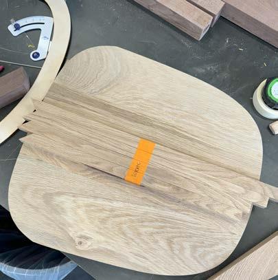 with envisioning a unique piece of furniture and fabricating it by hand in the woodshop. With a little over a month to complete this process, developing an innovative design was strategic and decisive. The main focus was to create a unique piece of furniture that could serve different purposes all while combining diverse design features such as curved and angled elements. Inspiration was drawn from Hans Wegner’s designs and specifically, his chairs with curved backs. Once the design was completed and calculated, the type of wood was selected and purchased. The process of dividing the chair into parts and identifying points of joinery, was a new challenge but created a deep understanding into the process of furniture production and techniques of woodworking. With the wrapped lounger completed, I was able to take away an appreciation for hands-on construction, detailed furniture design, and ergonomic understanding.