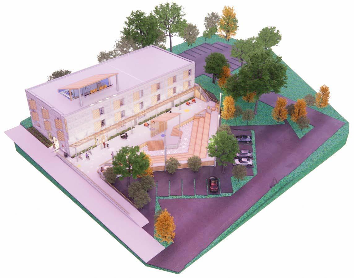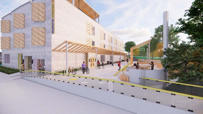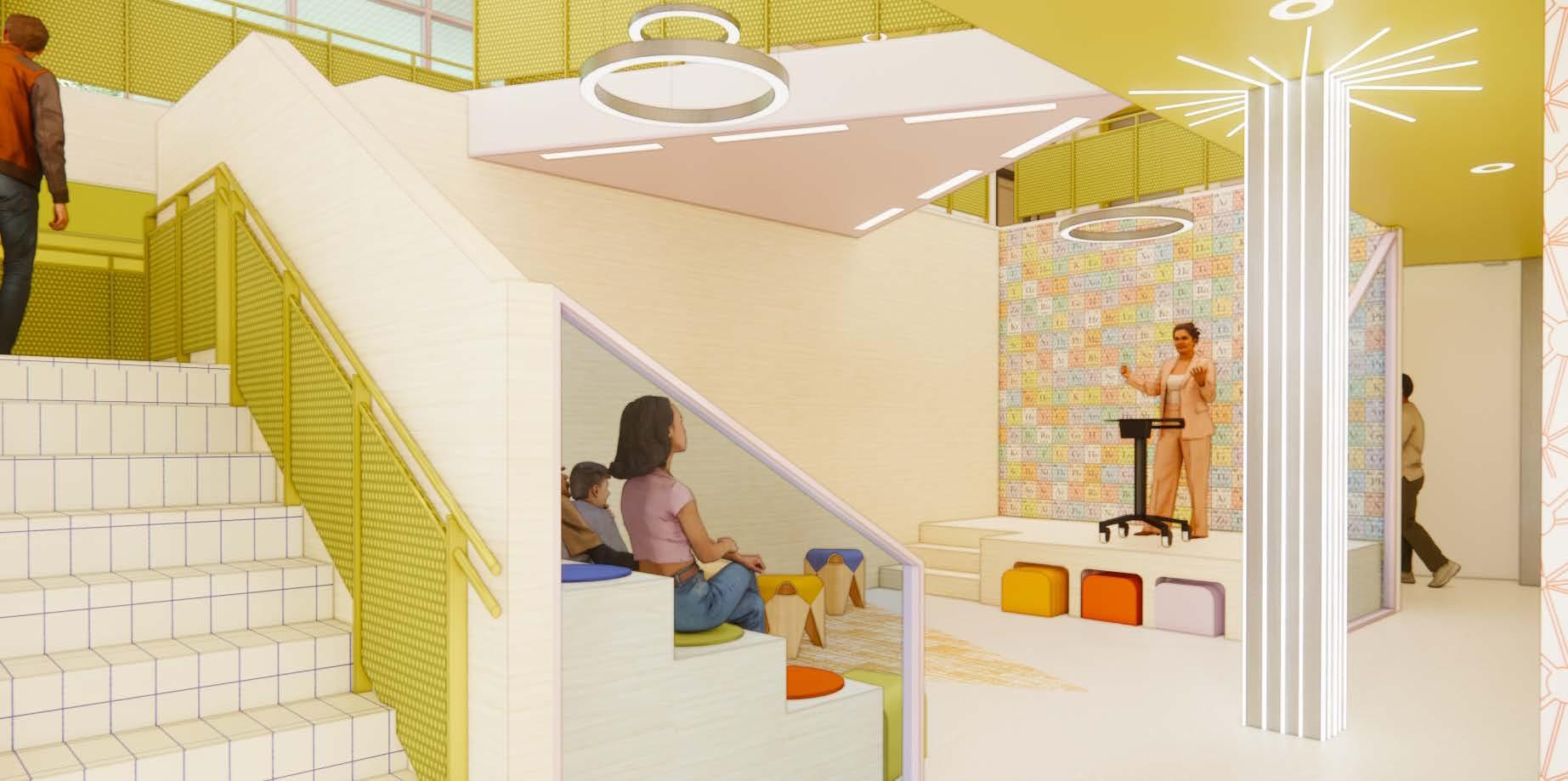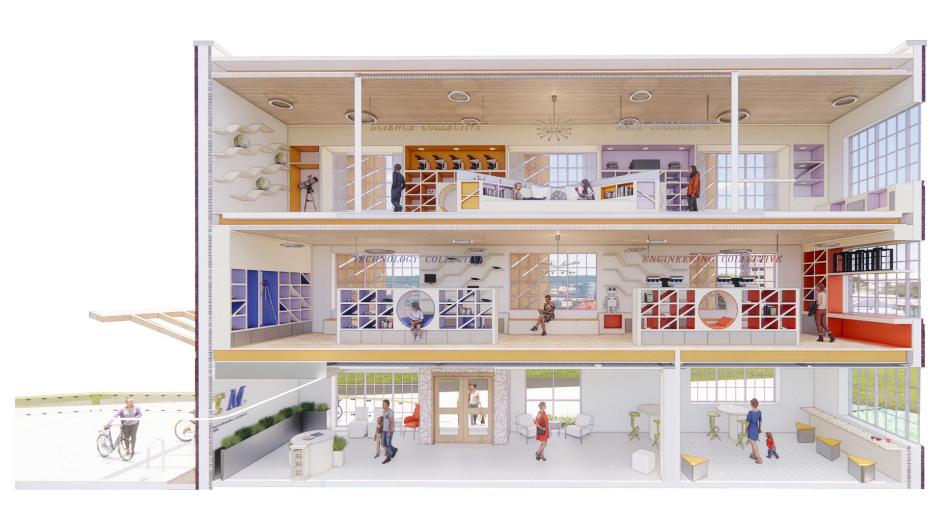 The outdoor landscape was one of the main focuses when designing an interactive STEM library. Located right off of West Avenue, it is surrounded by lively restaurants and shops. An outdoor amphitheater for community events and speakers, interactive learning elements, outdoor seating and swings, and bike storage were implemented into this outdoor area. The building facade was also modifed to incorporate a large skylight and window louvers to combat the harsh south-facing sun.
