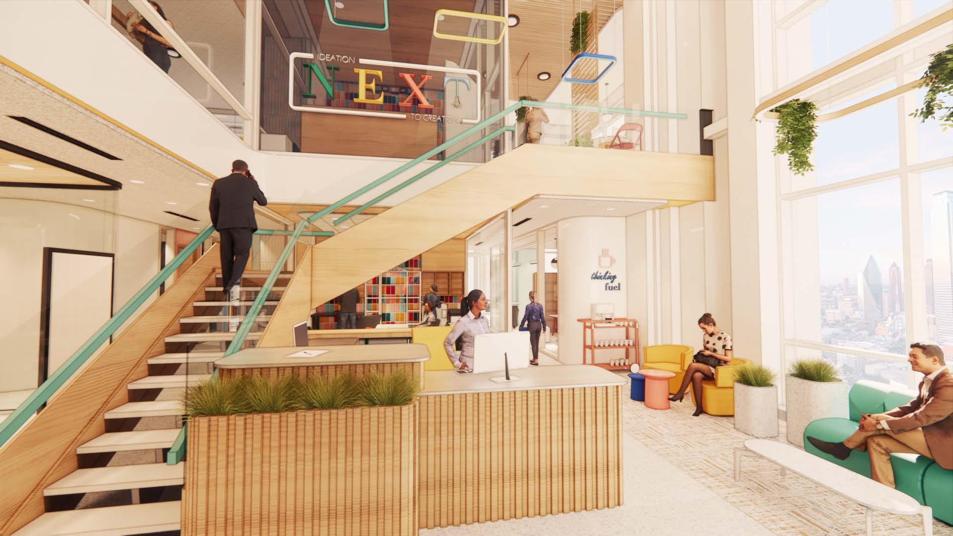 The Next office is an architecture and design workplace project located in Dallas, Texas. This third floor office was designed for 46 employees that desired a younger perspective on workplace design, bridging the gap between in-person and remote working, integrating digital and physical work together, and encouraging community throughout the office. Through these needs, came the design concept of “ideation to creation” which stems from the actual process of design. “Ideation to creation” embodies the process of developing ideas and bringing them to reality. This concept was chosen to allow Next employees to feel inspired and motivated to generate design ideas and bring them to life. The design concept was integrated into every decision regarding space planning, programming, built-elements, furniture selections, and bright material palettes. The user needs were prioritized throughout the office to incorporate flexibility and amenities that could mold with Next. The concept and overall design of this office provided a space for Next to create innovative design, collaborate with one another, and ultimately find resolution and success within the company.