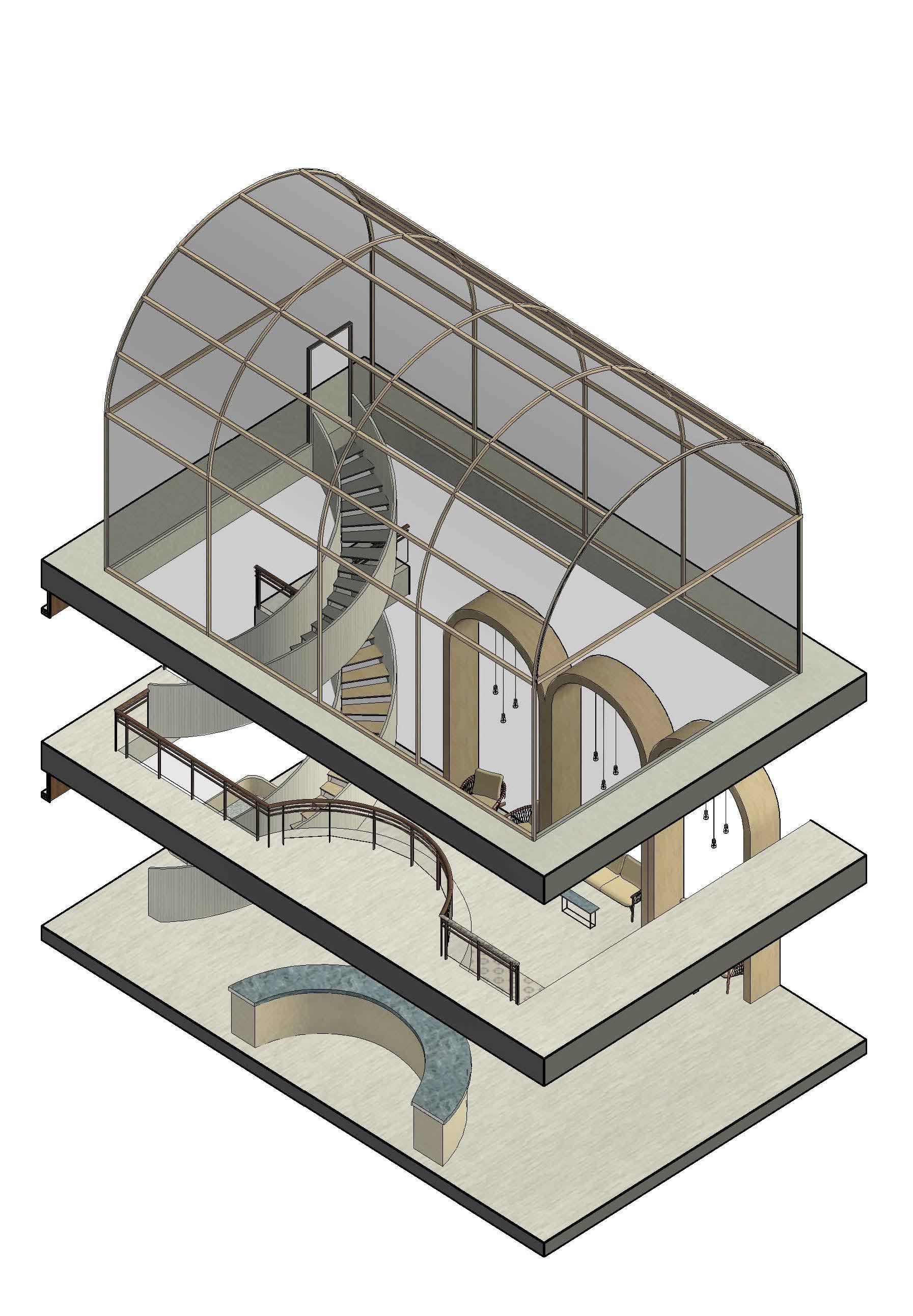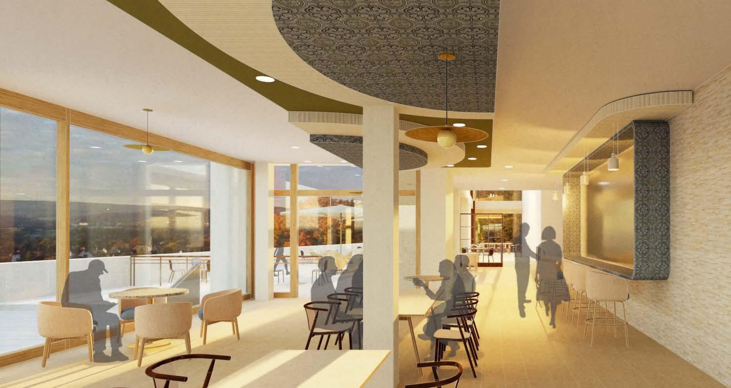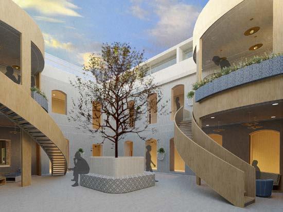 Incorporating semi-outdoor spaces was focal throughout this project. The existing building included many apertures that were taken advantage of to connect residents to the outside. The reception area included many curved elements to emphasize the concept of community between residents. Surrounding the top of the reception area is a dome-shaped glass roof. This piece gave a hierarchy to the reception, allowed for a vertical connection between all levels, and cultivated a unique experience upon entrance to the building.