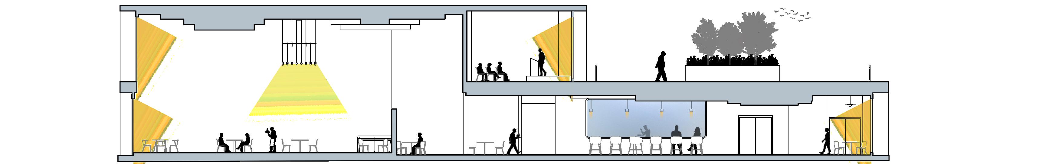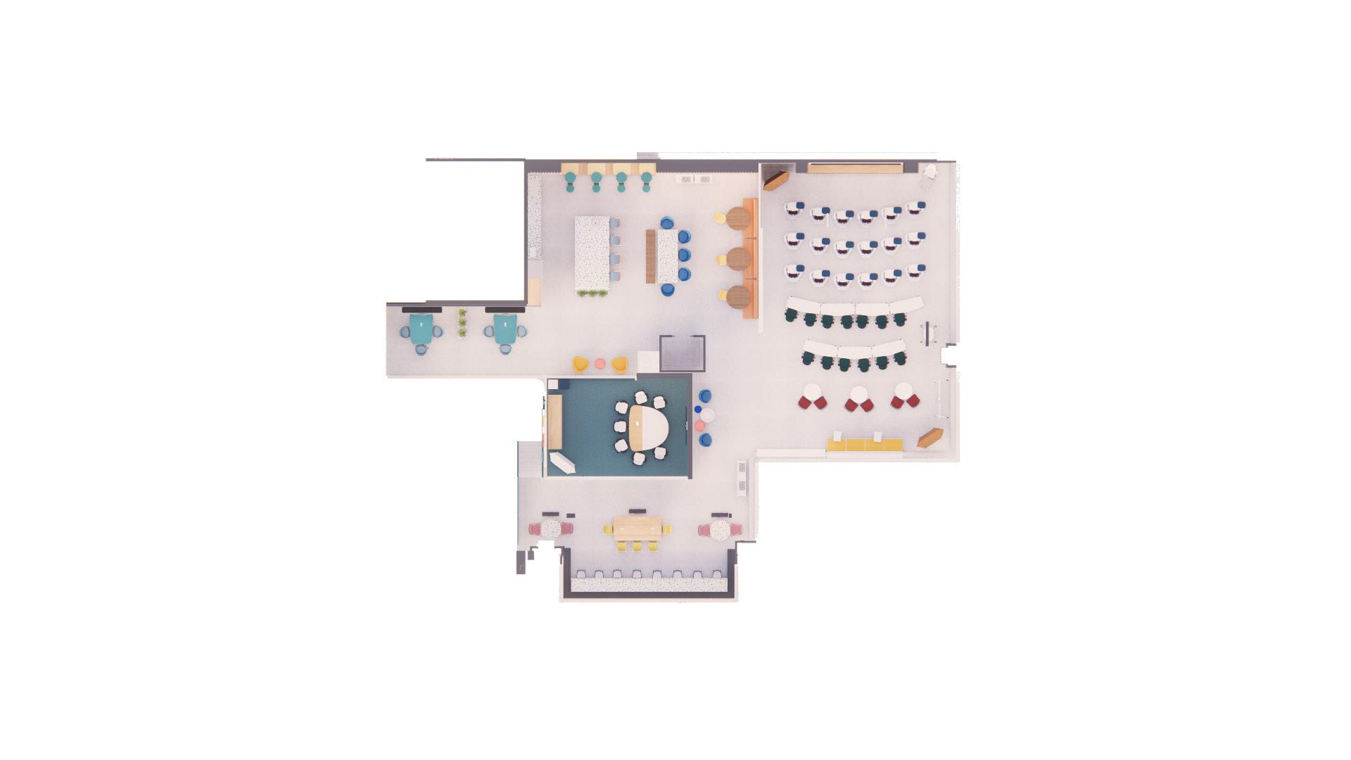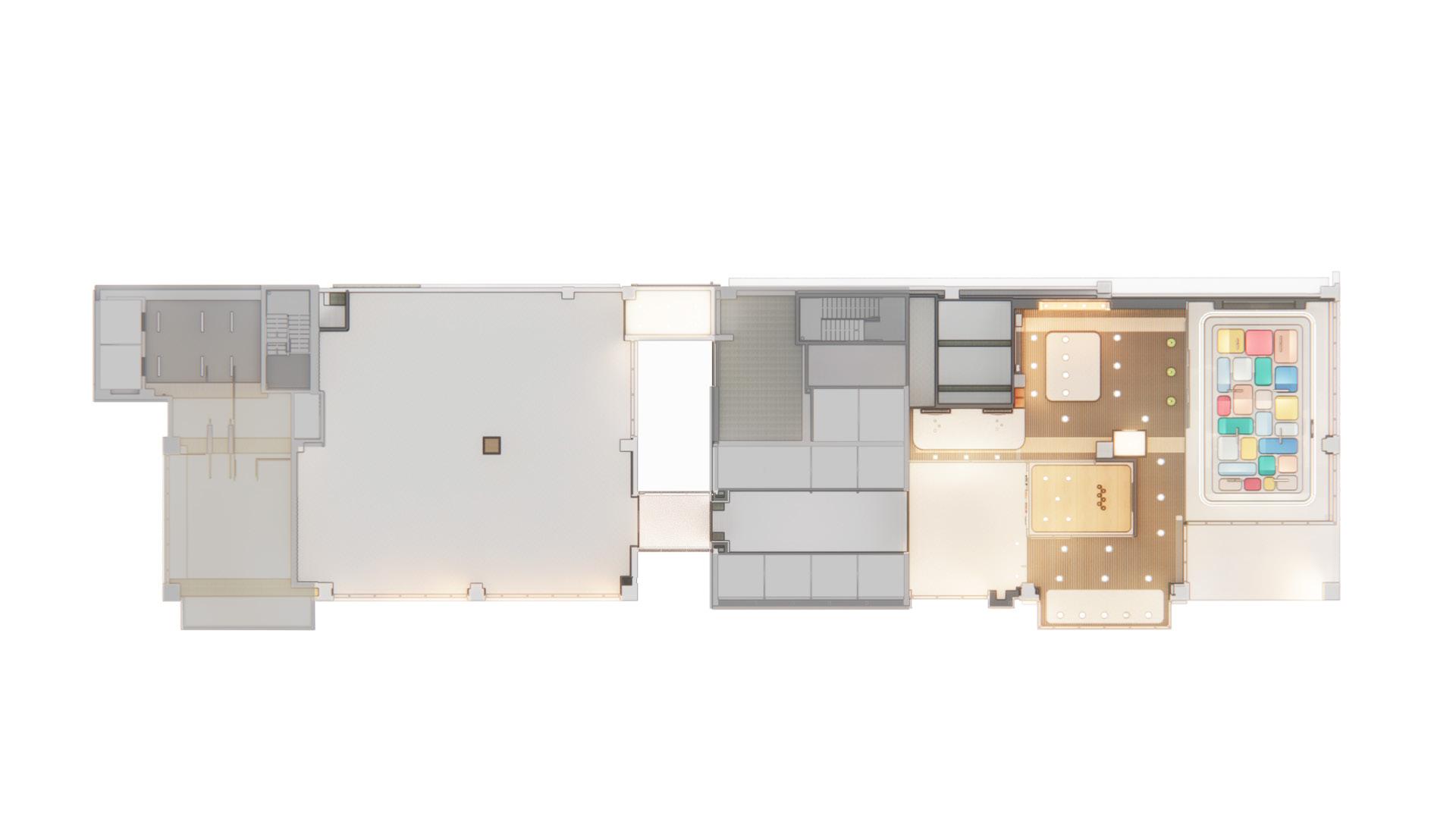 This mezzanine was designed to offer complete flexibility to Next. The first iteration shows the day time function with a separated work cafe and training classroom. The second iteration shows a night-time variation allowing for employees to open up the north side of the mezzanine to accommodate for a larger meeting or work event. This mezzanine is able to serve many other functions such as a larger classroom or workshops, with the help of movable furniture pieces and an open design.