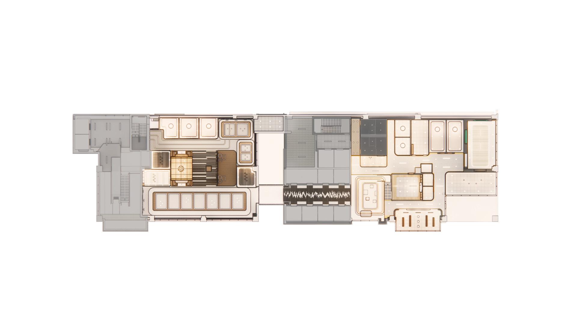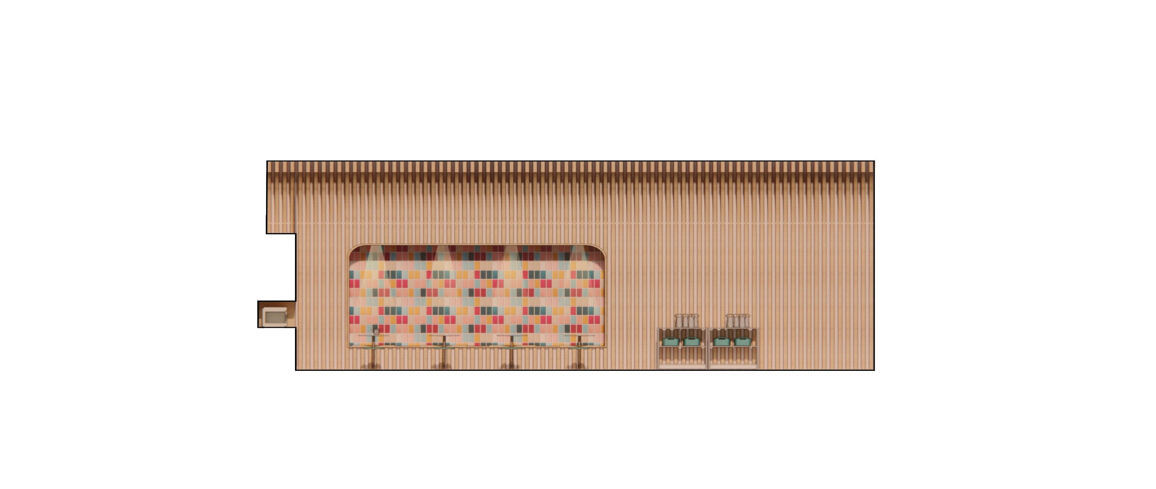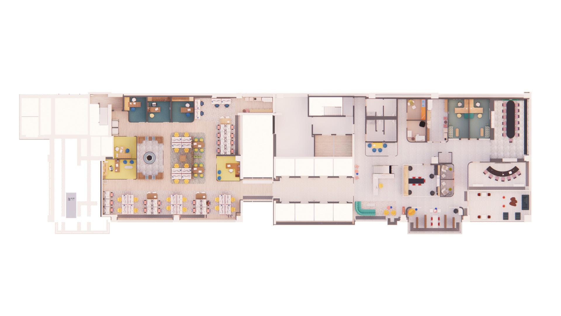 This mezzanine was designed to offer complete flexibility to Next. The first iteration shows the day time function with a separated work cafe and training classroom. The second iteration shows a night-time variation allowing for employees to open up the north side of the mezzanine to accommodate for a larger meeting or work event. This mezzanine is able to serve many other functions such as a larger classroom or workshops, with the help of movable furniture pieces and an open design.