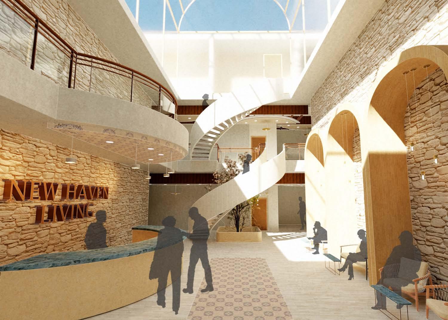 Living center was created. This historical monastery located in Paderborn, Germany was converted into an active adult living facility catered towards clients 55 and above. New Haven offers a new season of life for residents to enjoy relaxation, community, and contentment. The building features residential suites, a restaurant, bar and cafe, game room, pool, fitness center, library, performance space, rooftop garden, and courtyard. The programming design was fixated on encouraging community and togetherness. Focal points such as the courtyard, restaurant, and reception area create innovative spaces for socializing and interacting within the Paderborn community. This project strives to break the stigma of typical facilities, by offering a contemporary environment for residents to enjoy their finer years and indulge in what brings them joy.