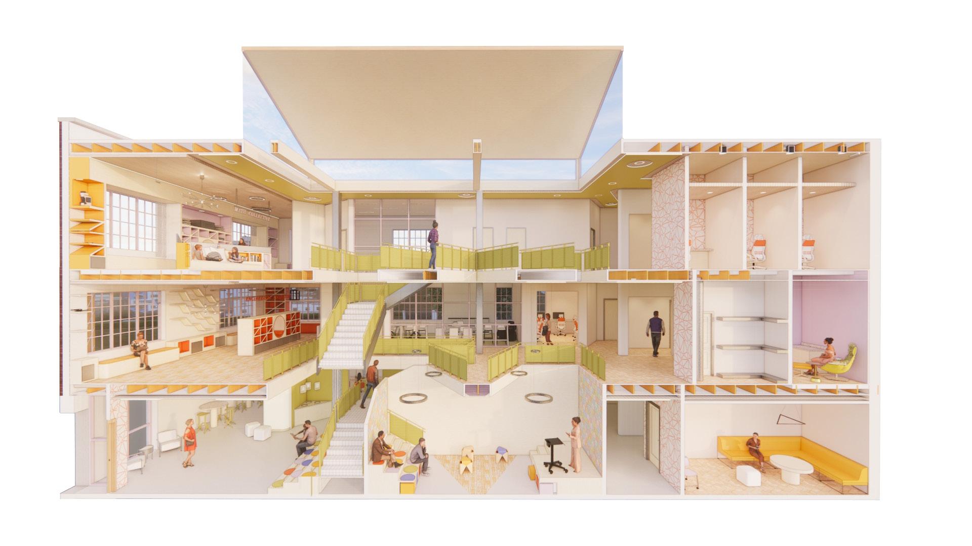 This conceptual space plan highlights the process of zoning to ensure mindful connection was provoked throughout the space. Programming was placed from west to east sides of the building to help guests in terms of way finding and circulating the library in a practical manner.