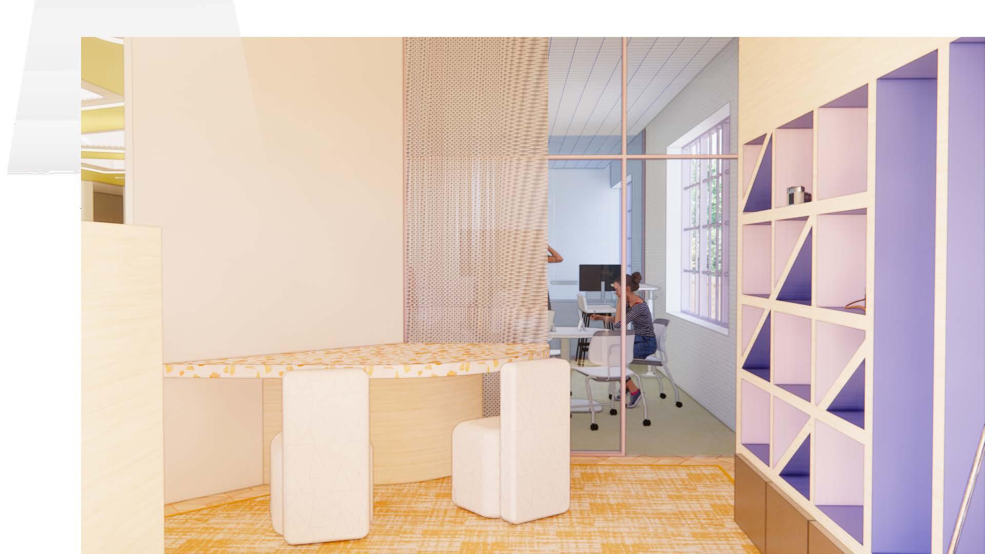 The entrance/reception area is the main welcoming point and first impression of the STEM library. There are 2 main entrance doors located on the west and south side of the building allowing access from the street or outdoor learning area. The focal point of this entry is the custom reception desk. This piece was designed to best fit the circulation of the space and assist guests from multiple angles. The desk features varying heights to accomodate accessibility needs as well as cove lighting to add an ambience to the space. To the right, a physical model and construction plan drawing can be seen that aided in the design process and decision making of this millwork piece.