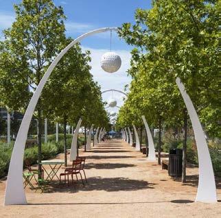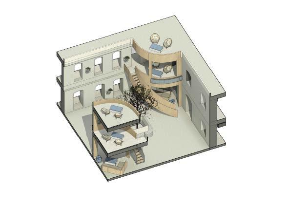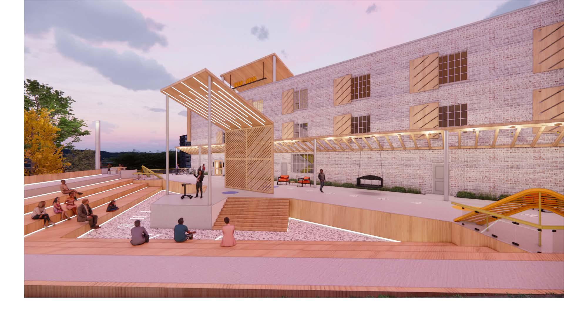 The centralized tree with arches and surrounding seating serves as a focal point in the space. With the tree representing the outside built environment, the surrounding bench and arches represent NEXT collaborating together to bring