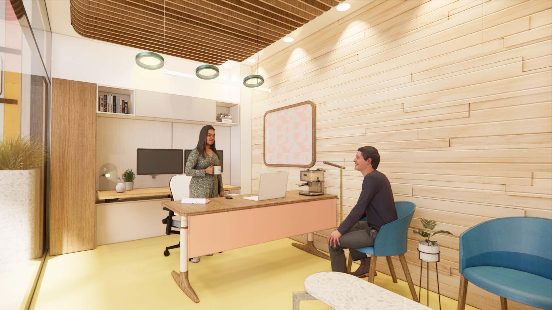 Designed for a studio director who is responsible for staffing projects and ensuring they run smoothly. This office is located in the west “ideation” side of the building with close proximity to workstations and other offices for communication between departments.