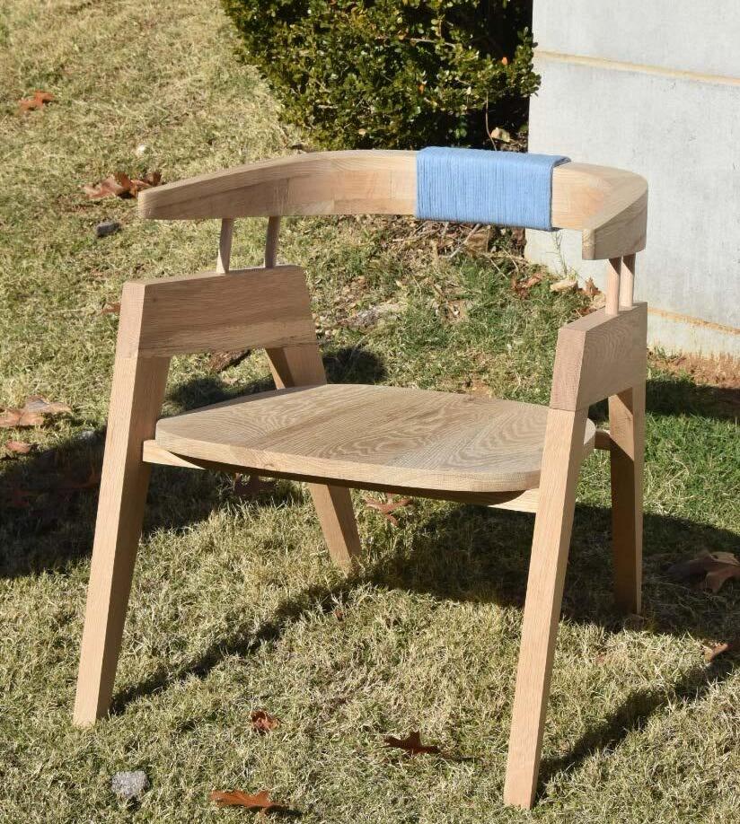 The final product of the Wrapped Lounger has a modern edge that is softened by the warm oak wood and blue cotton wrap. The construction of this chair was a complex process. With the curved back and angled legs many joints and tedious cuts were needed. The curved back required three layers of angled seams and took multiple weeks to cut, secure, and shape. Joints were put into the back, the legs, the supports, and connecting dowels. Assembling the chair became challenging with the angled profile and floating backrest. The frame was secured first, and then the dowels were drilled to allow for connection with the back rest. After, the seat was dropped in and screwed through the supports for extra security. Finally, the recycled cotton yarn was wrapped around the back for extra comfort and added color.