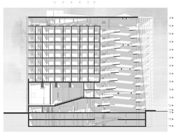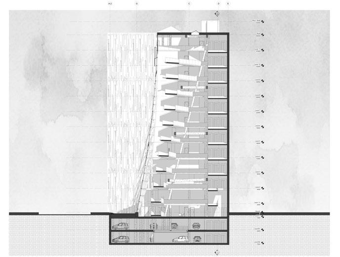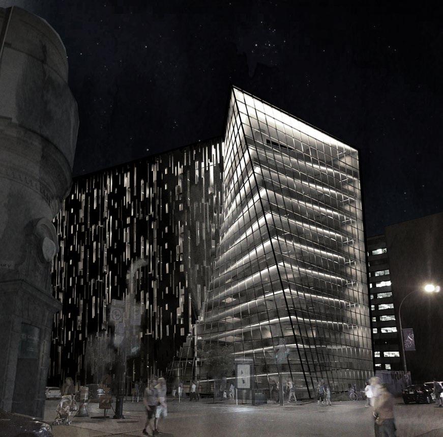 The objective for this studio was to design a hotel with an added specific program. Place des Arts Hotel showcases a sculptural 14-storey gallery space and offers a large auditorium as an extension to all theaters and concert halls in place des arts (Montreal downtown area). The facade is created with an ensemble of modulated fiber-reinforced composite panels. The goal was to achieve a random-looking pattern while only using one panel that would be repeated and mirrored throughout the facade. Views and natural daylight are maximized while still offering privacy for the users. The 14-storey ramp would have exhibition space and would display all sorts of local sculptures throughout the void.