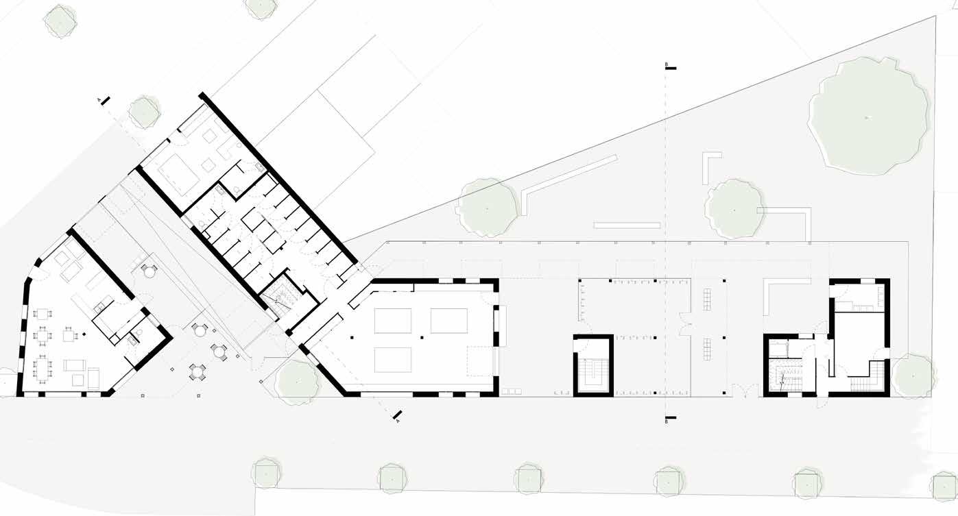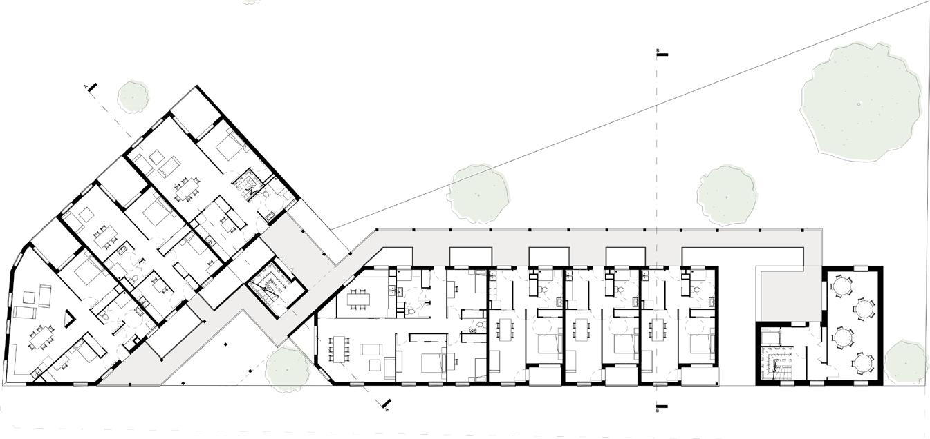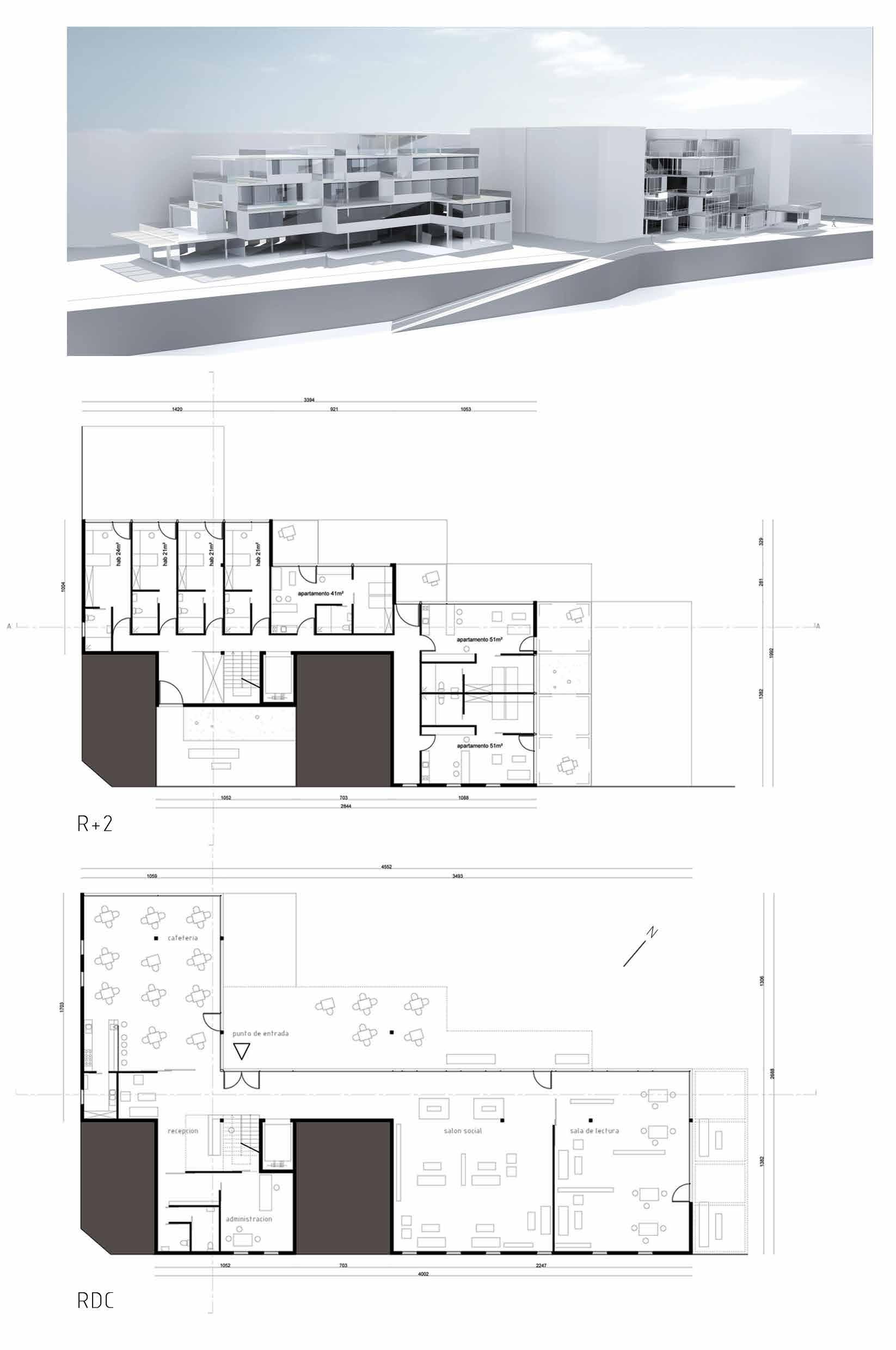 Dans le volume bas s’alignent les chambres donnant sur un espace vert à l’est. le volume haut est une déformation du premier permettant de cadrer des vues.