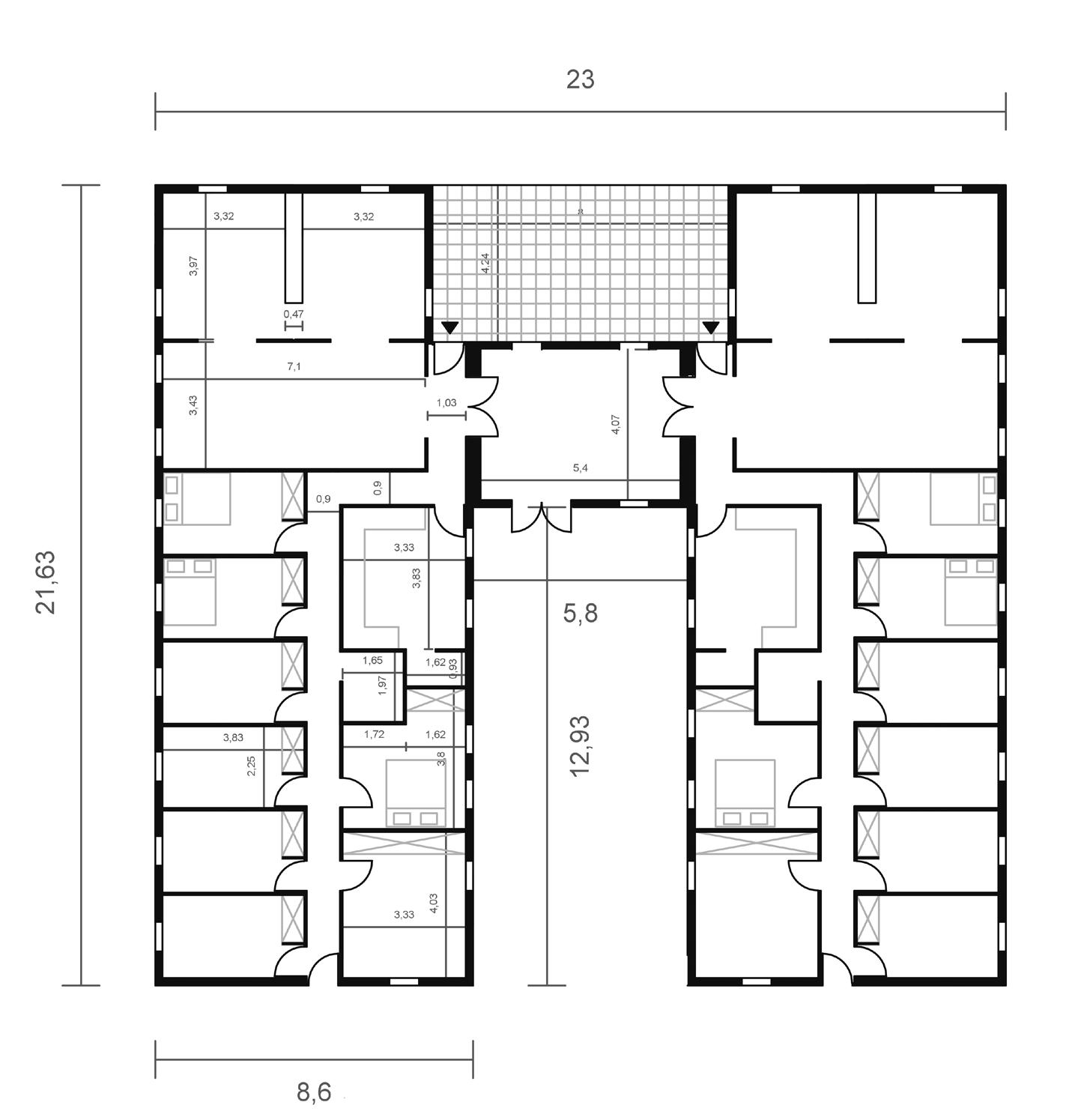Deux volumes, contenant les espaces individuels, sont positionnés dans des directions différentes. Ils se rencontrent et créent les espaces communs.