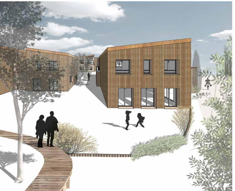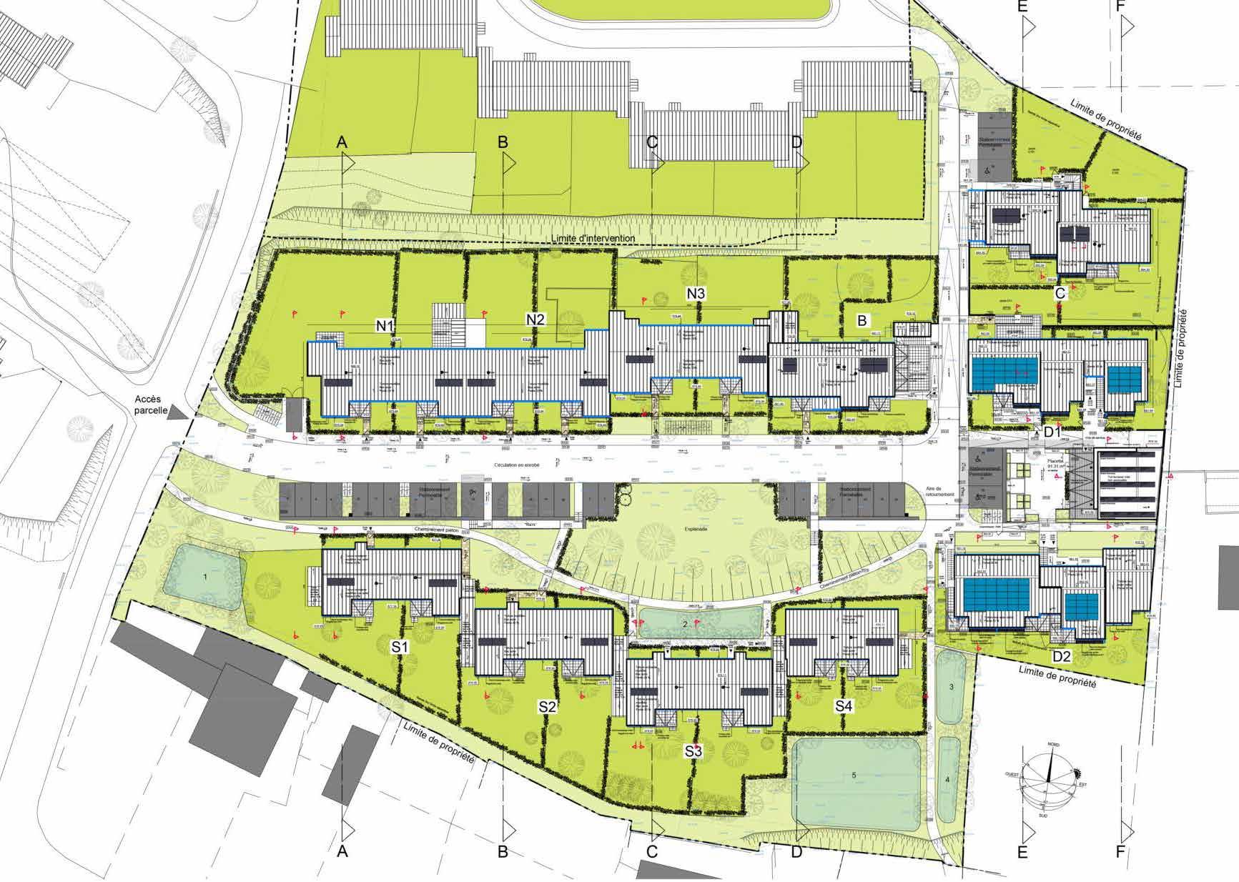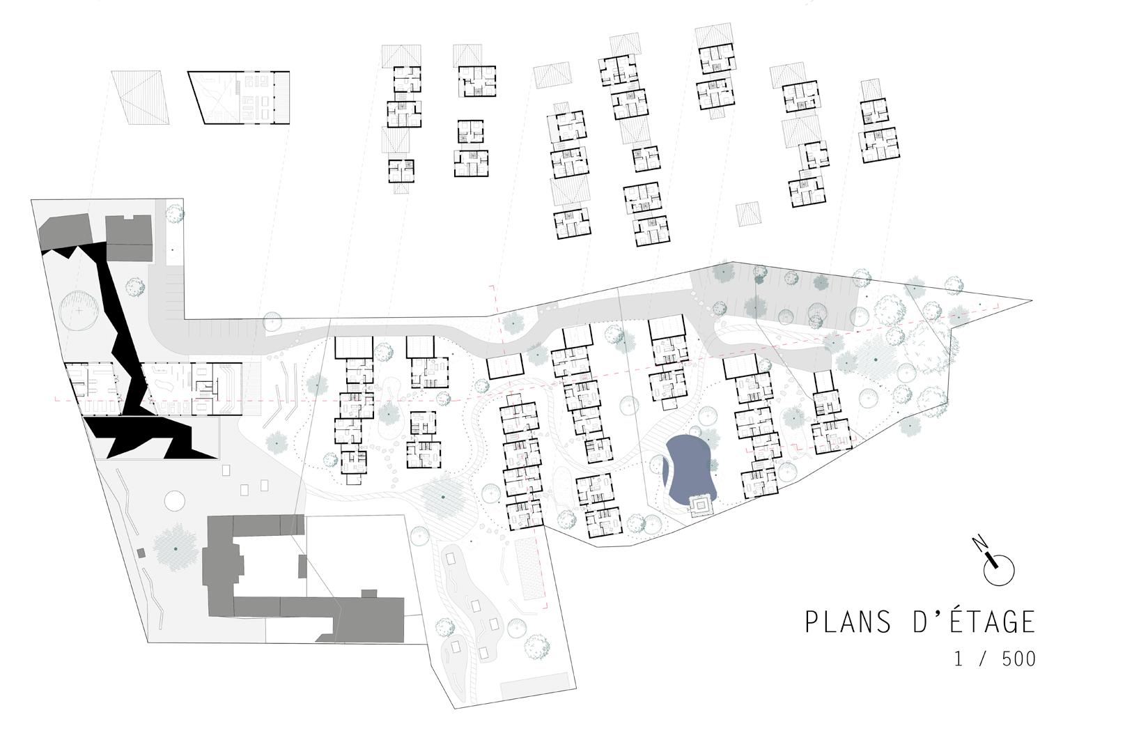 Il est composé de plusieurs espaces publics et d’une zone résidentielle se déployant autour d’un chemin fluide qui mène à la forêt.