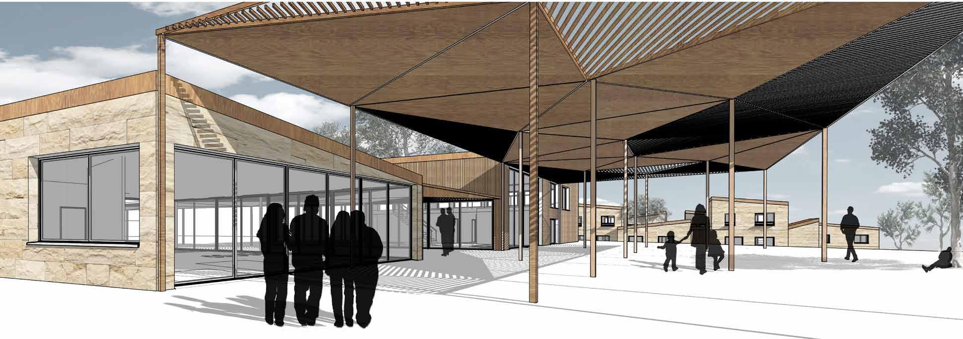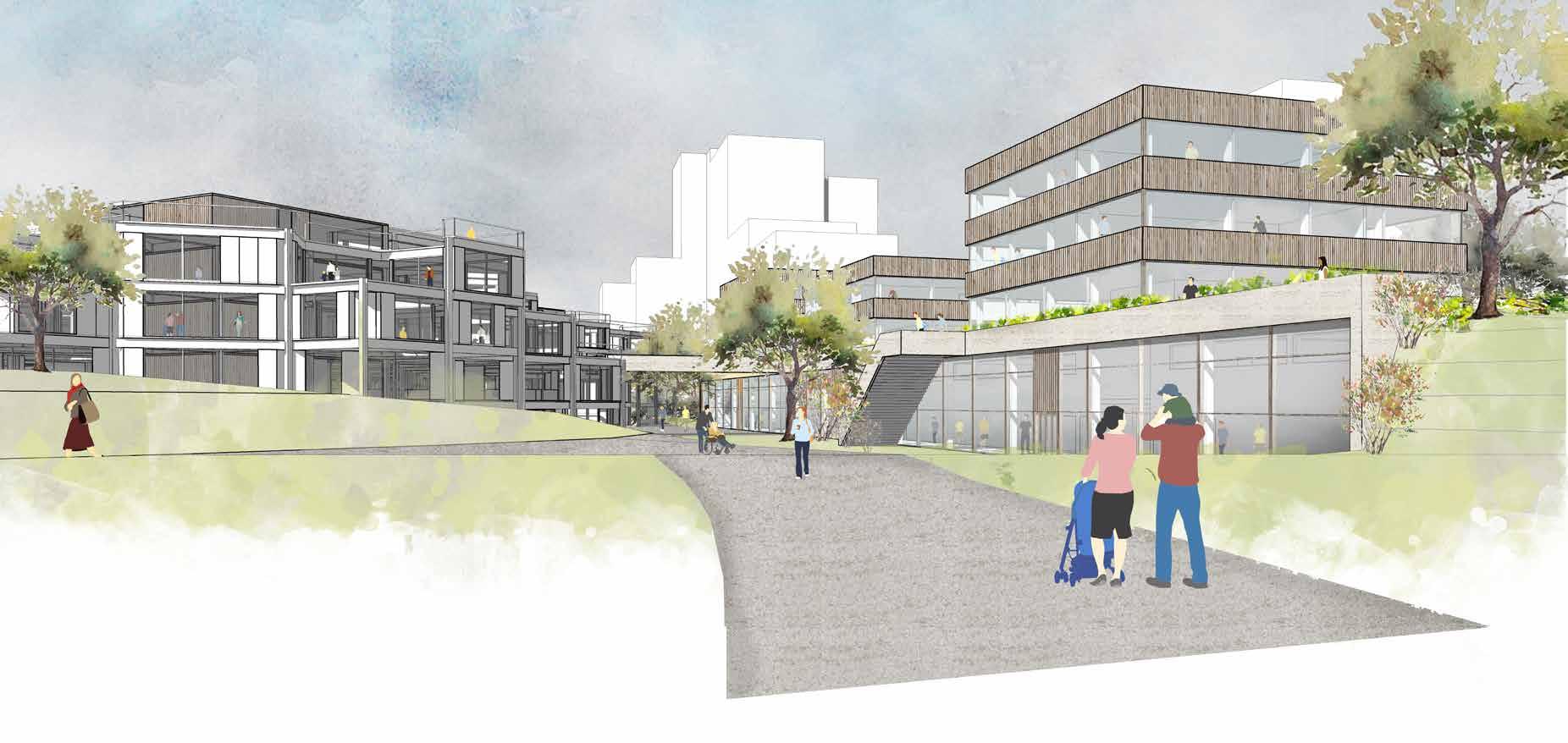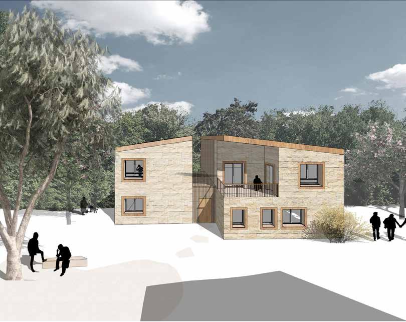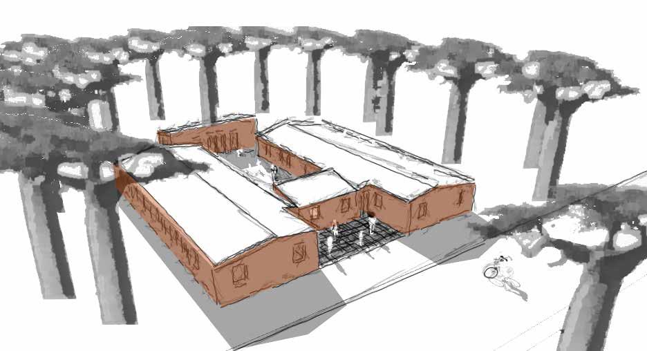 Il est composé de plusieurs espaces publics et d’une zone résidentielle se déployant autour d’un chemin fluide qui mène à la forêt.