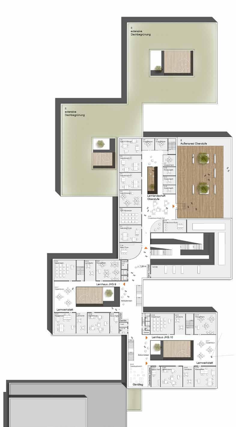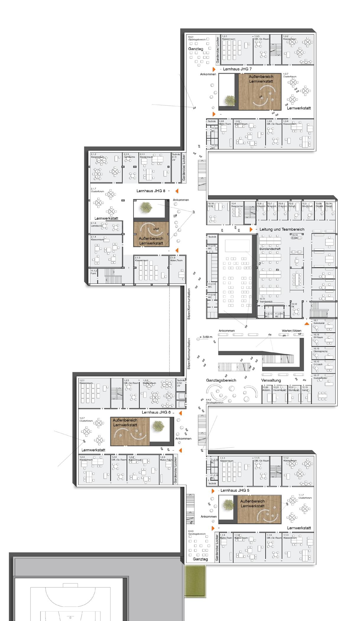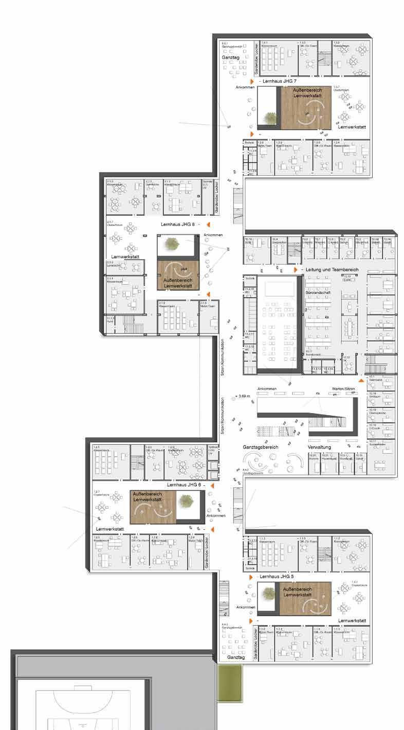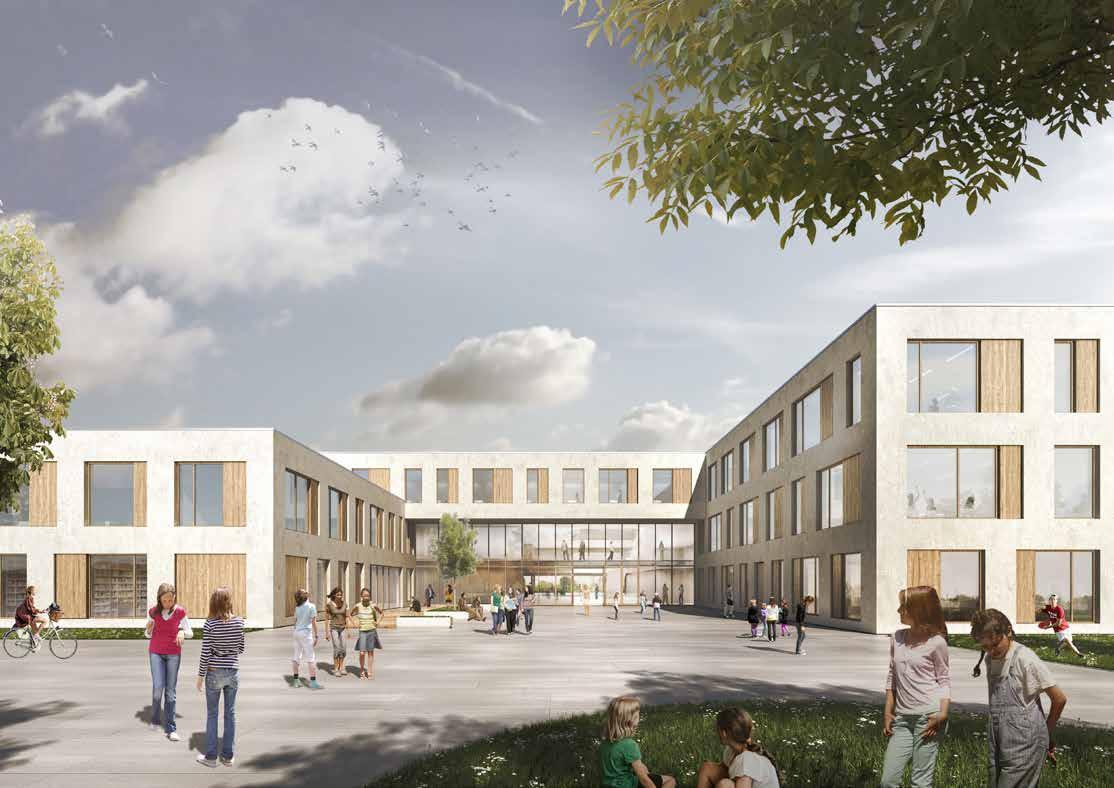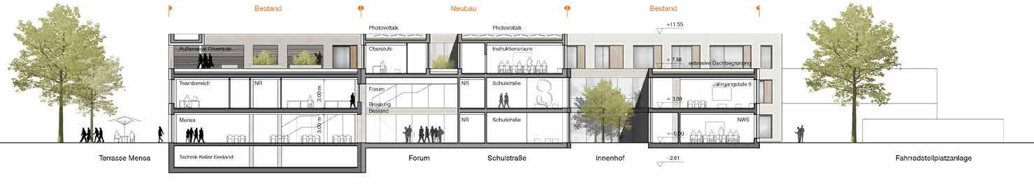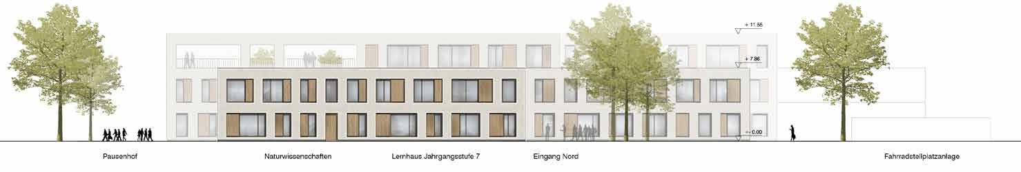 Ce projet réalisé pour un concours au sein de l’agence BAU WERK STADT à Bonn, consiste en la réhabilitation d’un collège dans la ville de Gütersloh. Le bâtiment existant a été construit dans les années 1950. Il s’agit d’un squelette de béton, donc les façades en bande sont marquées par d’épais garde-corps en béton également.