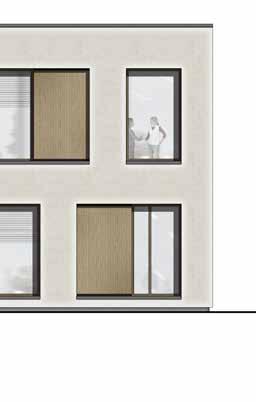 La façade Sud est reculée de 3 m par rapport à la limite de la rue, ce qui génère un espace tampon re couvert d’une pergola qui vient repousser la limite avec le privé. On retrouve à l’arrière un espace plus intime propice à l’aménagement d’un jardin planté