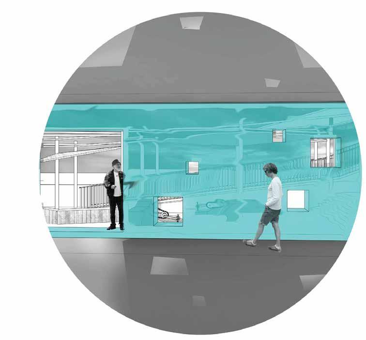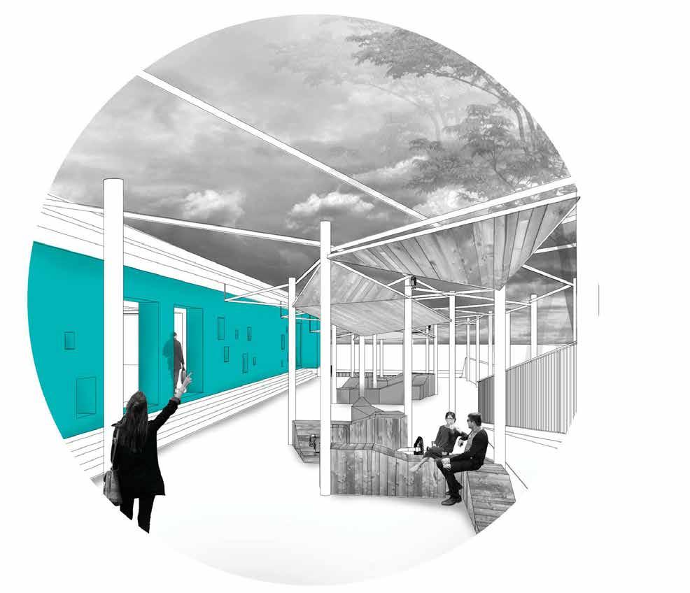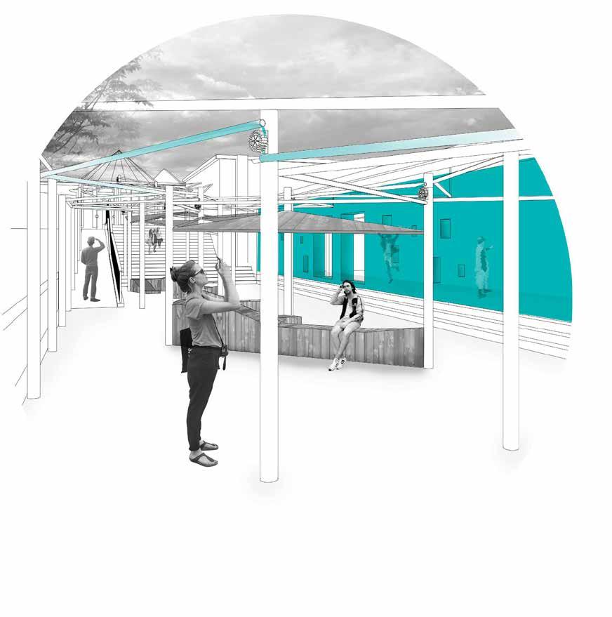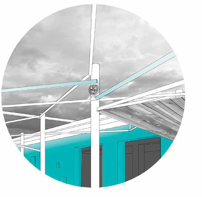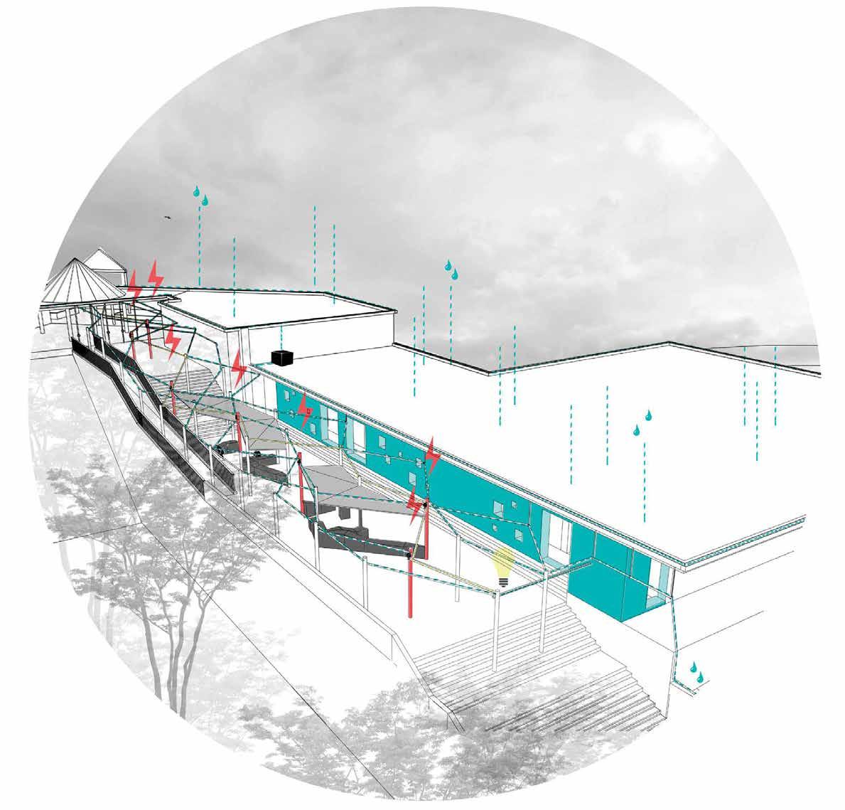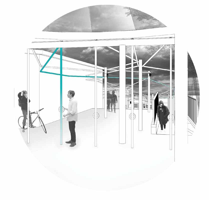 Le projet s’articule autour de l’écoulement de l’eau selon un parcours sur le site. Ainsi, nous ajoutons un système de récupération de l’eau à travers un chéneau contournant les toitures du bâti existant. L’eau parcourt ensuite les tuyaux de poteau en poteau, ces derniers étant parsemés sur le site de façon à modifier la circulation piétonne. Leur dessin permet la création d’une résille en toiture, générant un paysage au-dessus des passants.