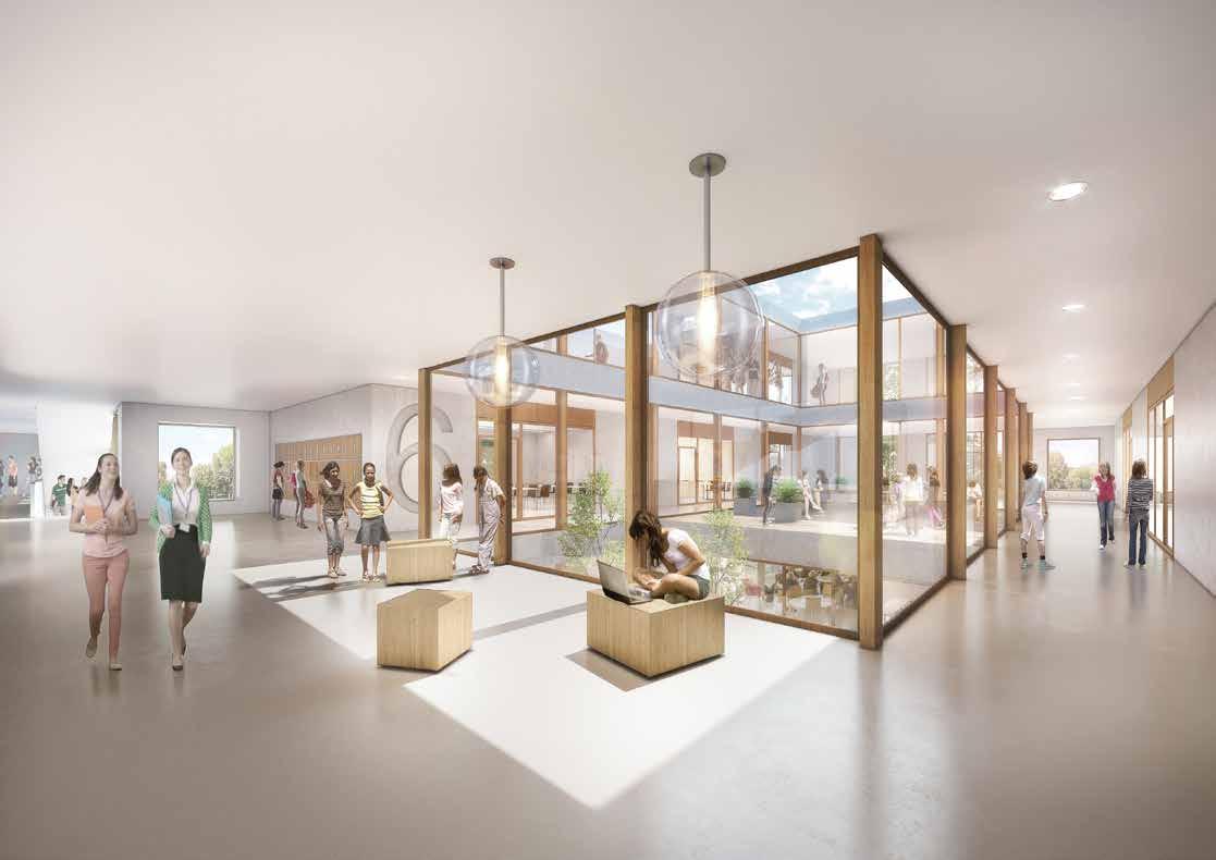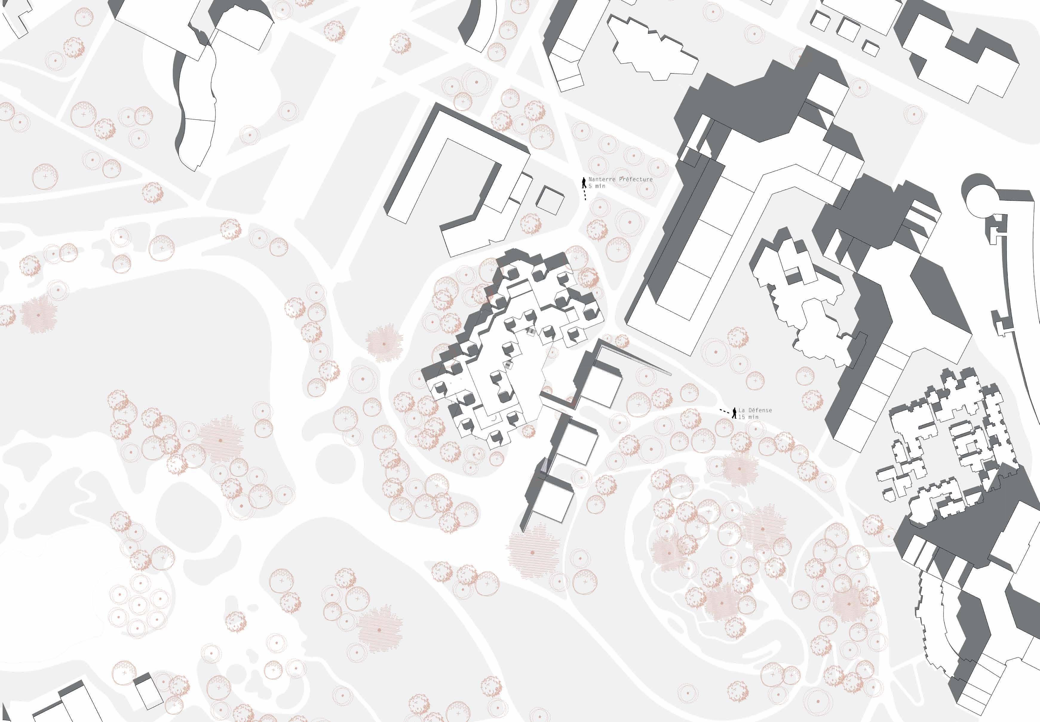 L’école a été conçue pour être reliée au parc André Malraux. Il s’agit donc d’imaginer une nouvelle vie pour le quartier du parc de Nanterre, en ouvrant l’école au public. Ce travail s’articule donc entre une approche territoriale et paysagère, puis une approche programmatique, spatiale et sociétale.