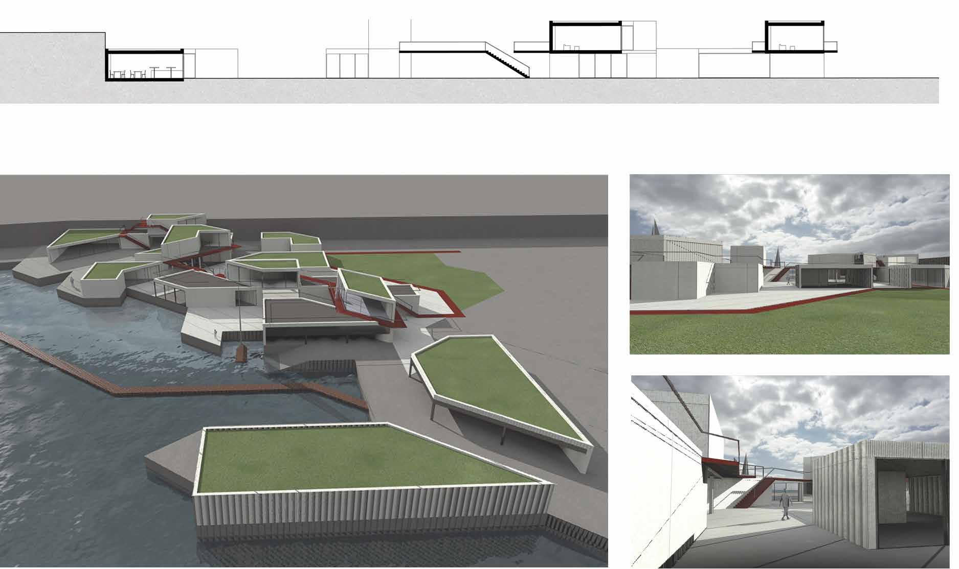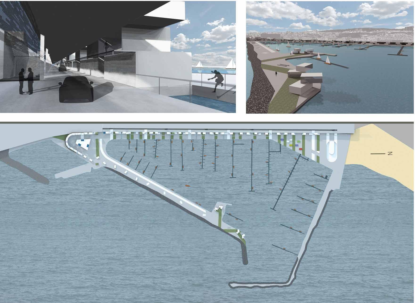 Le nouveau port de plaisance consiste en la continuité et la progression de volumes empilés le long de la ligne qui marque le quai, dans une composition de pleins et de vides. Le complexe croît et se densifie à mesure que nous nous approchons de la courbe, pour rediminuer quand commence la jetée. L’idée est basée, à la fois sur le positionnement des pierres de la jetée, puis dans l’empilement de containers portuaires, présents dans le paysage.