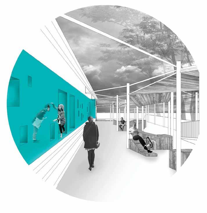 Un grand axe piéton aménagé relie les deux plus grands espaces : la place publique du pôle le plus dense du projet, et le skatepark - qui permet la transition avec la plage.