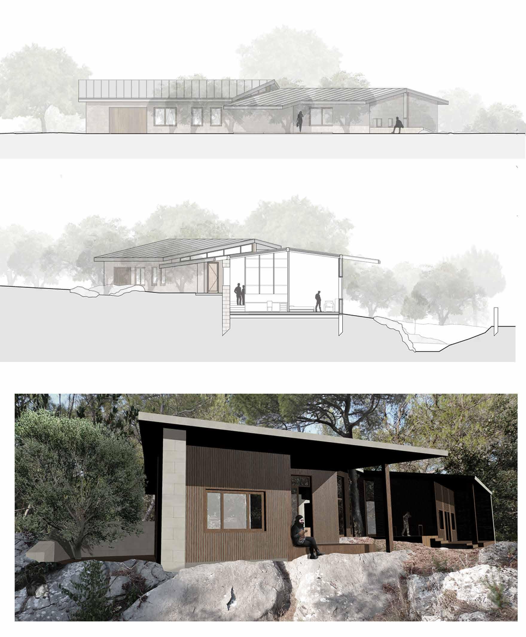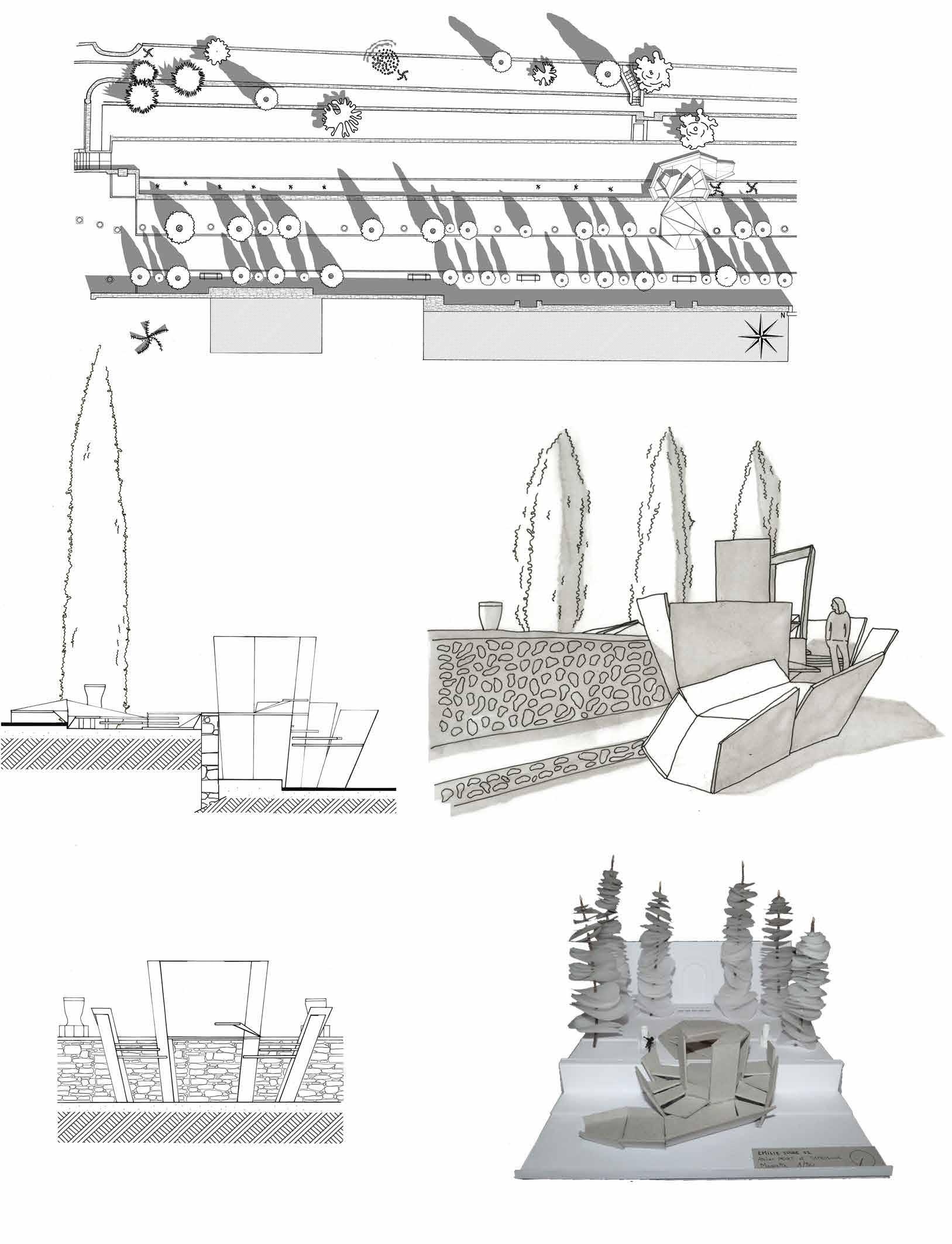 Ce projet en deux parties consiste à créer, dans un premier temps, une topographie en tant qu’espace d’assise ou de détente, suivie d’une structure couverte permettant de relier la partie haute et la partie basse du terrain.