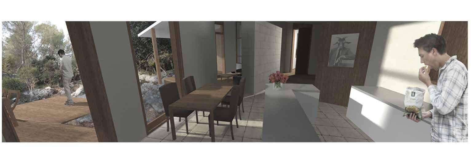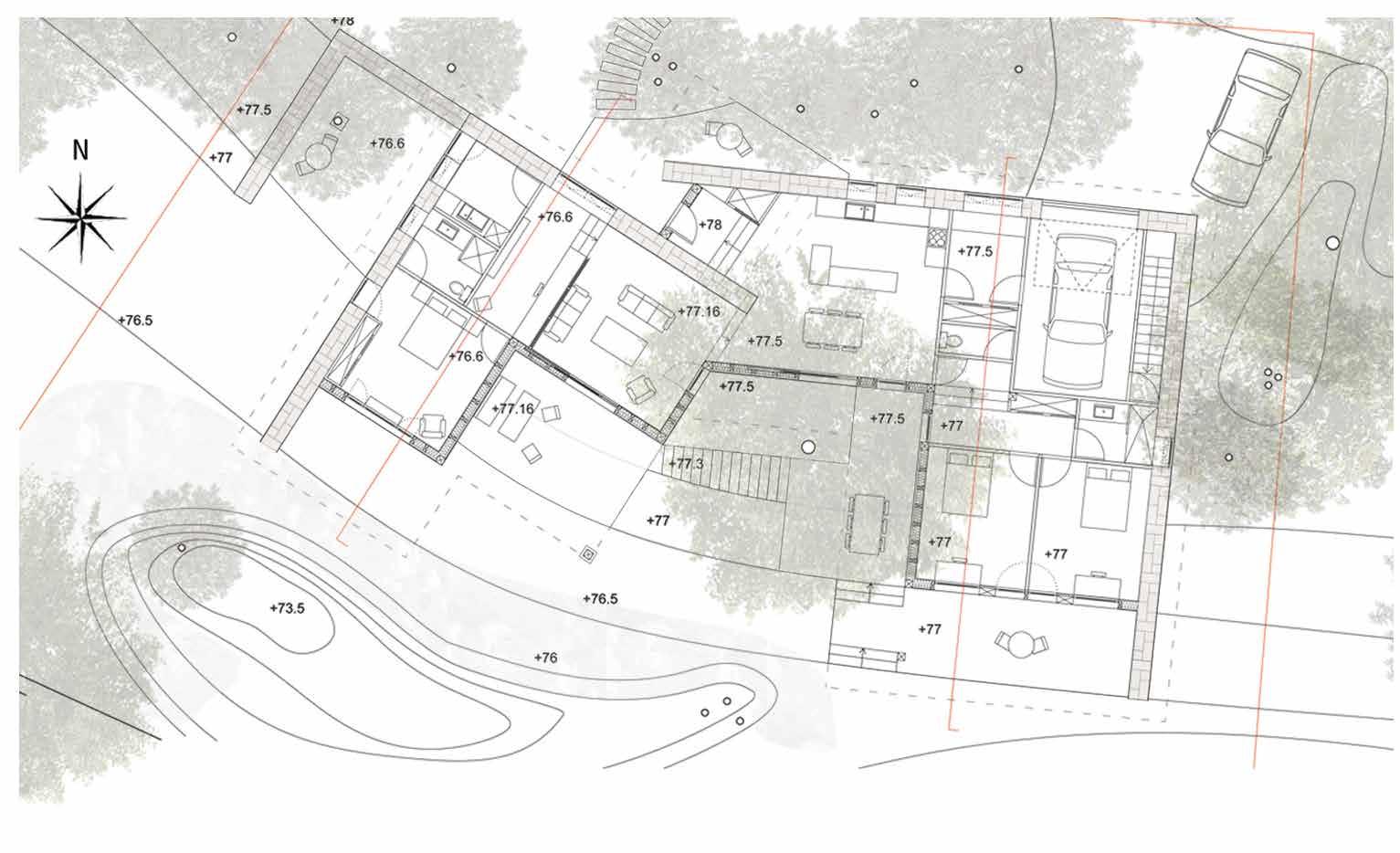 La maison se parcourt de la même façon que se pourrait parcourir le terrain, plus on avance dans les volumes, plus on descend. Aussi, chaque volume est orienté selon la topographie existante.
