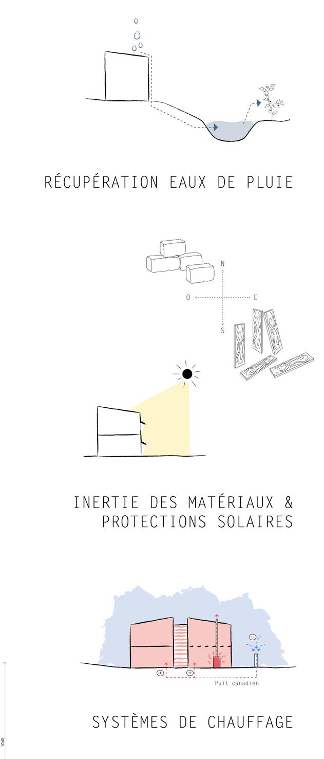 Les façades sont pensées de manière bioclimatique : la façade sud est munie d’un bardage bois, de grandes ouvertures verticales ouvrent les espaces sur le jardin. L’arrière de la maison est construit en pierre. Les ouvertures se font plus rares, protégeant ainsi des vents du Nord.