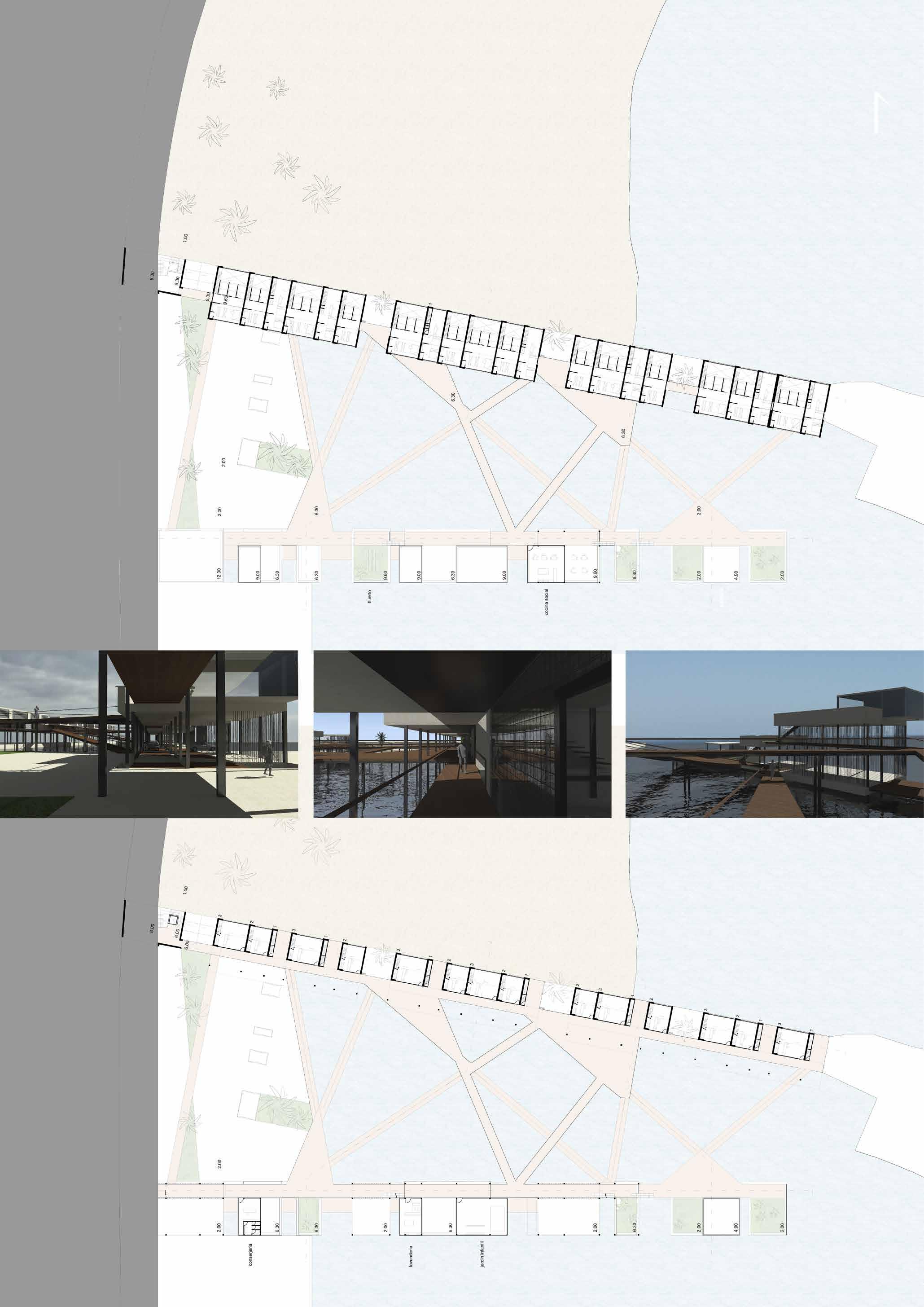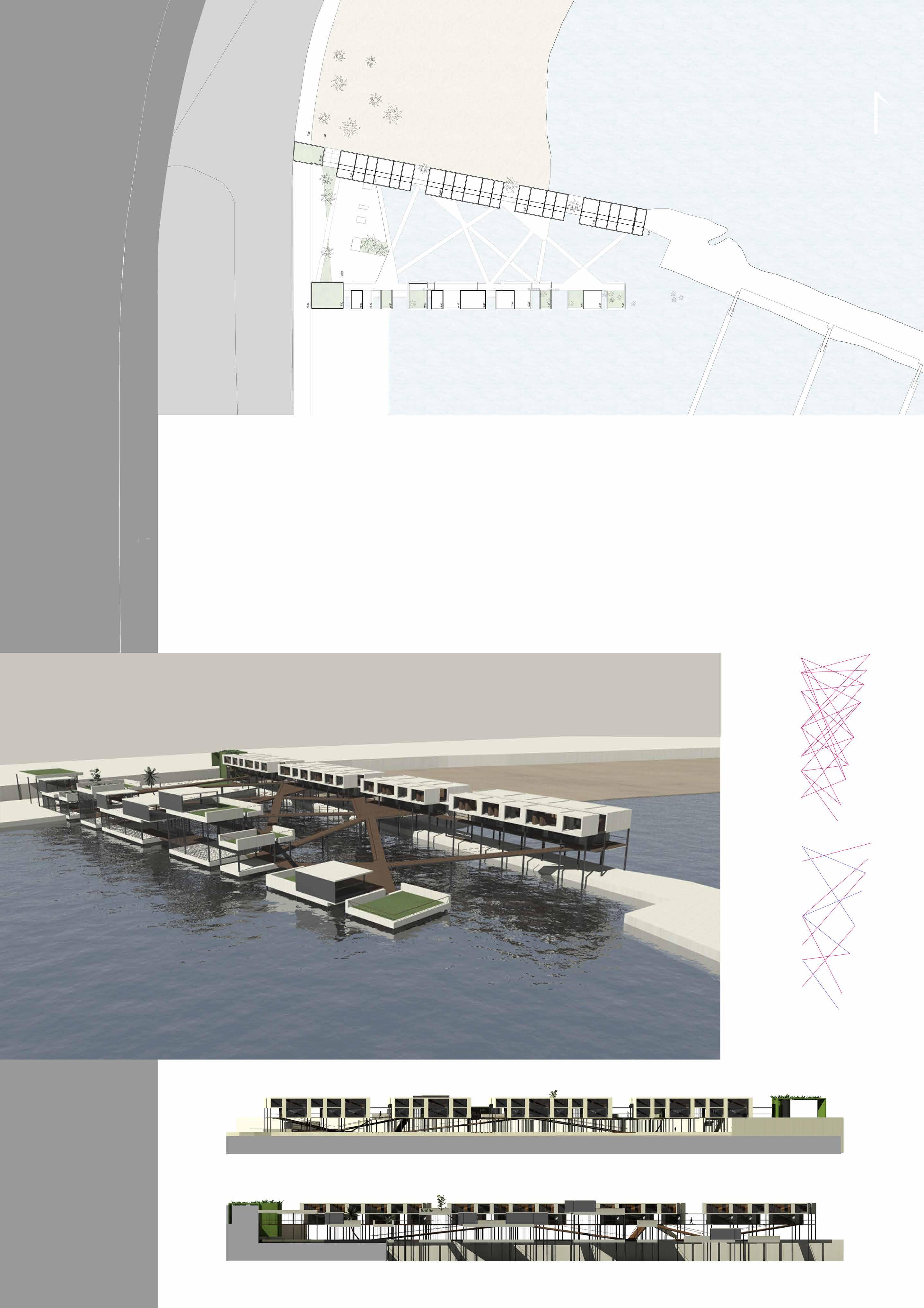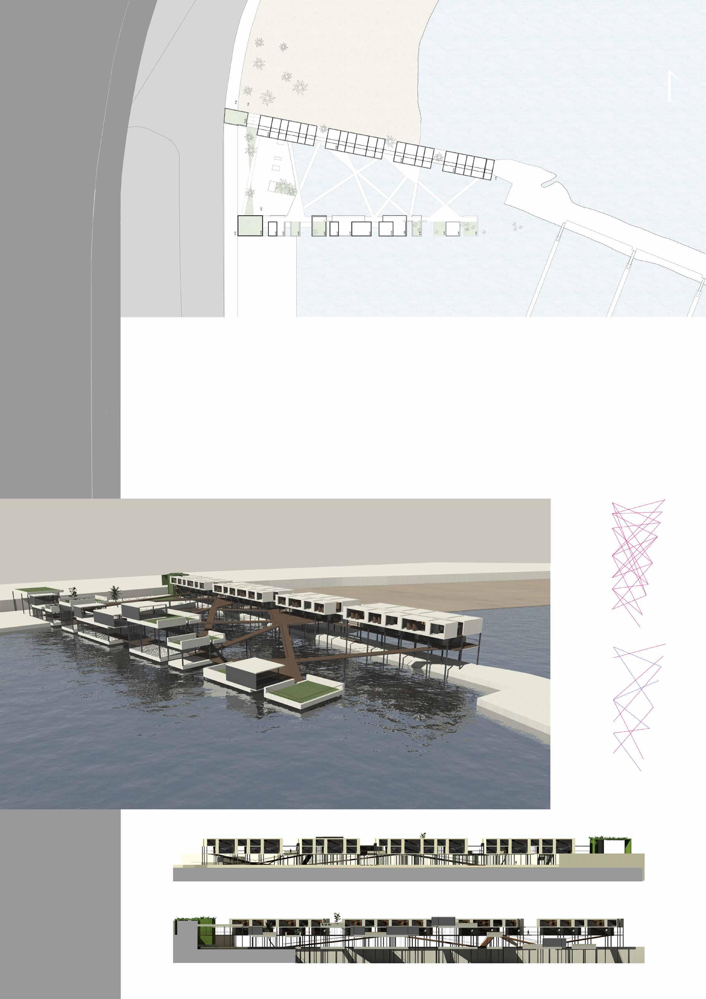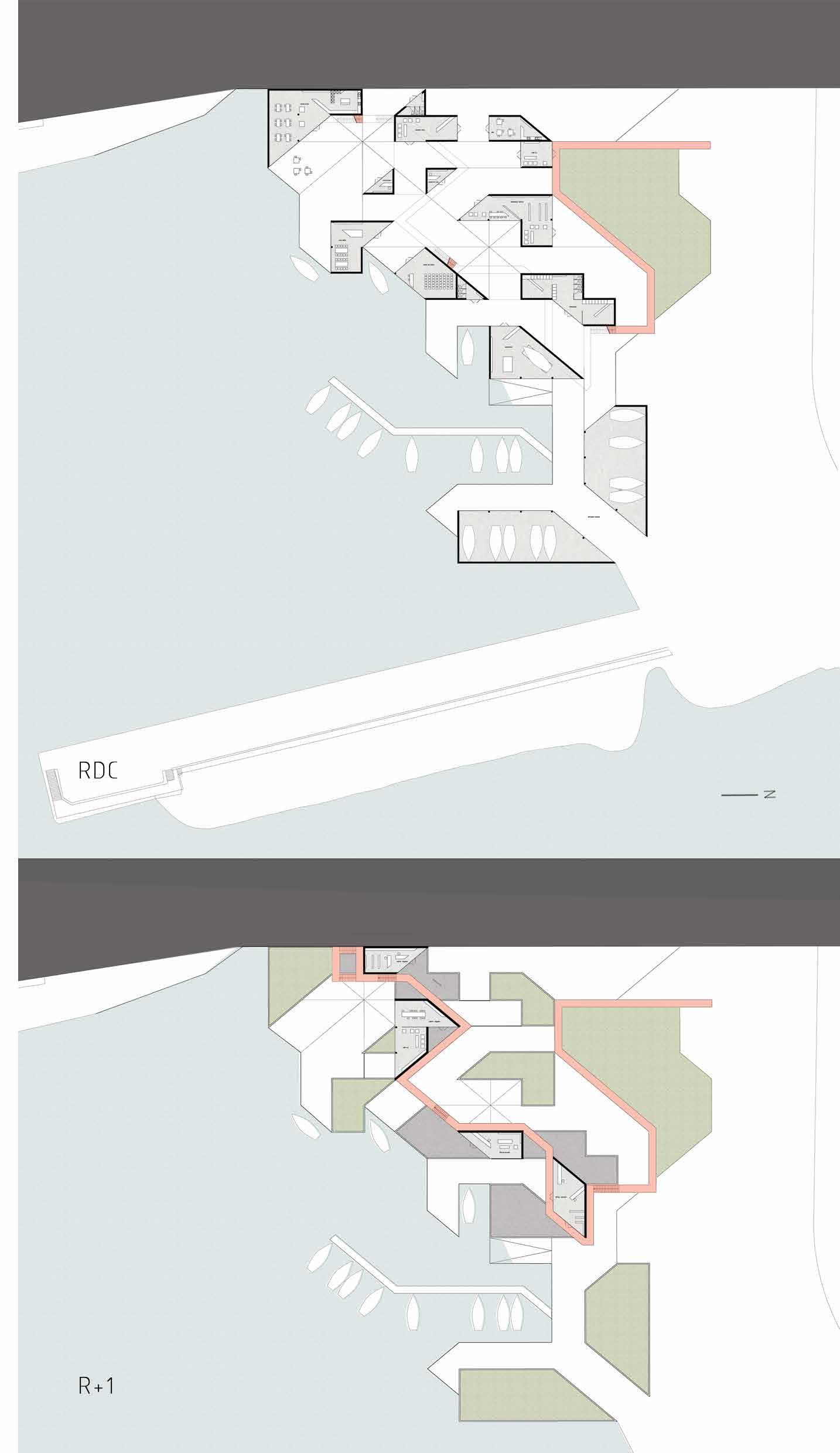 Le second bras vient mettre une limite entre le projet et le port pour préserver l’intimité des habitants. Très poreux, il laisse ainsi passer la lumière du Sud. Les quelques volumes posés sur des plateformes de béton accueillent les espaces collectifs totalement vitrés.