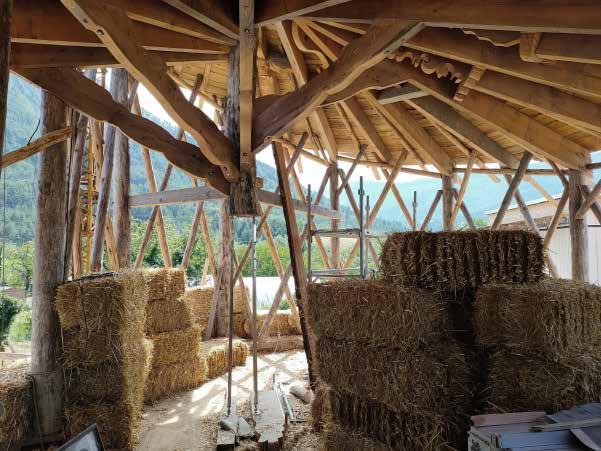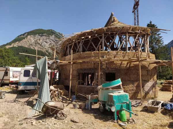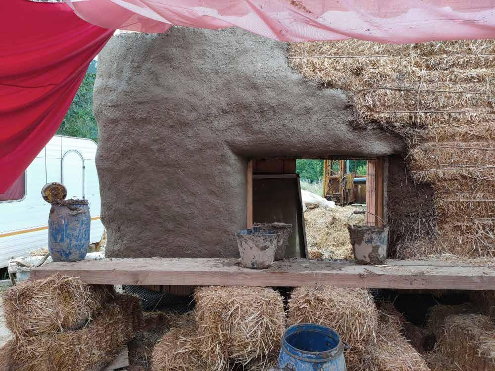Les murs sont construits sur trois épaisseurs : une résille en bois, soutenant la charpente, des bottes de paille accrochées à l’aide de cordes de chanvre puis un enduit de terre et de fibres. Les matériaux viennent pour la majorité d’un rayon de 15km autour du chantier et ont été transportés à vélo ou en camion électrique. La terre provient du terrain lui-même.
