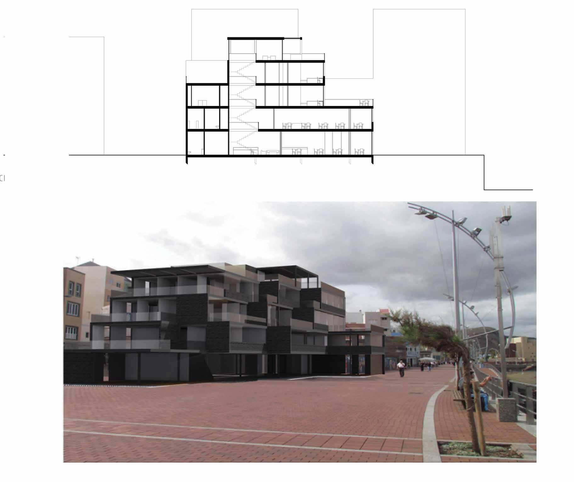 Les logements se situent au Nord, offrant des vues spectaculaires sur la grande plage de Las Alcaravaneras. Son autre façade donne sur le vide central du projet. Cet axe est composé de trois types de logements (T2, T3 et T4) regroupés en quatre volumes permettant une certaine porosité.