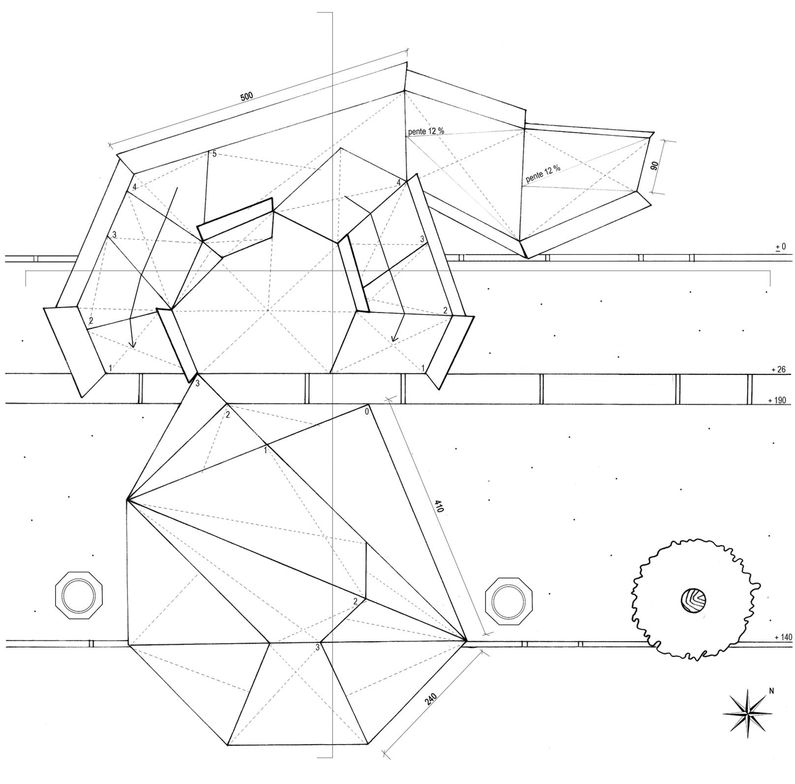 Le passage reliant les deux niveaux est composé d’un abri dont la structure reprend la forme et le système constructif de la topographie. La forme octogonale se répète, puis se déroule pour inciter le visiteur à parcourir l’allée du bas.
