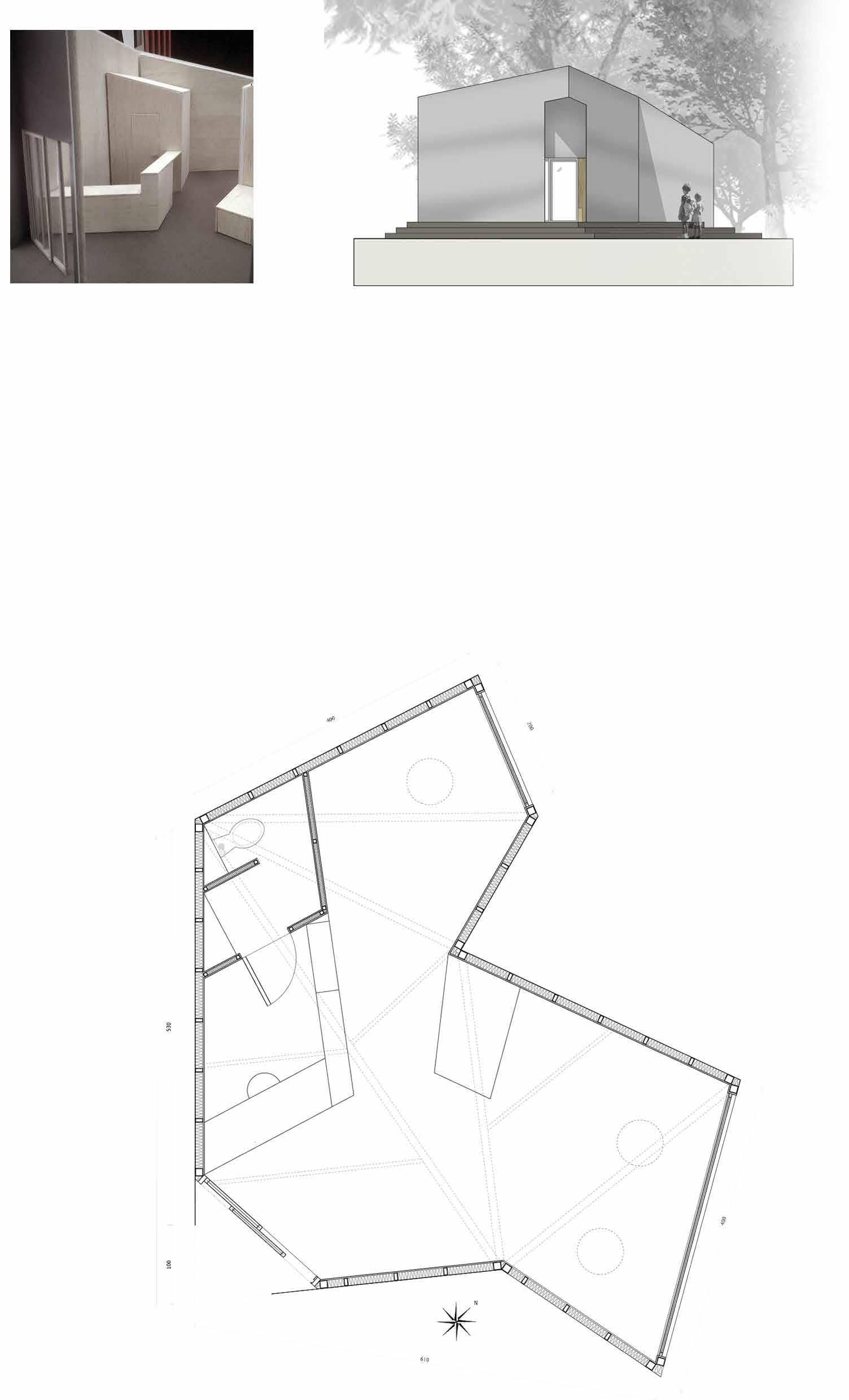 La forme naît d’une maille reprenant les directions du contexte, créant ainsi un module triangulaire de 6x9x7.5m. Les volumes se font face et la relation entre eux est dans la tension entre leurs parois. Ainsi, le projet est structuré par le vide.