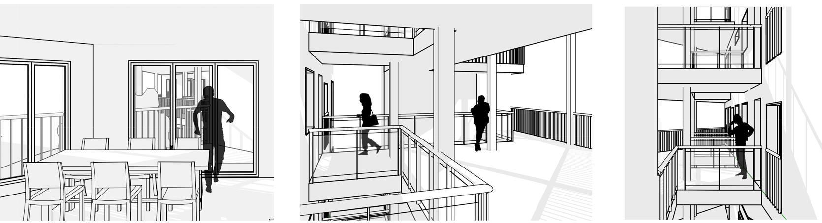 Les appartements sont desservis par le biais d’une coursive qui file entre les deux volumes. Celle-ci se situe côté jardin, les habitants sont donc en contact direct avec la nature à la sortie de leur appartement.
