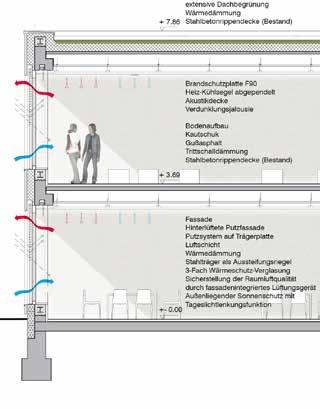 Partant de l’existant, nous avons choisi de préserver le squelette en béton et de créer par-dessus un système de quadrillage en façade, également en béton. Les vides générés sont par la suite soit vitrés, soit remplis par des panneaux de ventilation en bois. Le choix du béton relève du lien avec l’existant, alors que celui du bois se rapproche de considérations écologiques et durables.