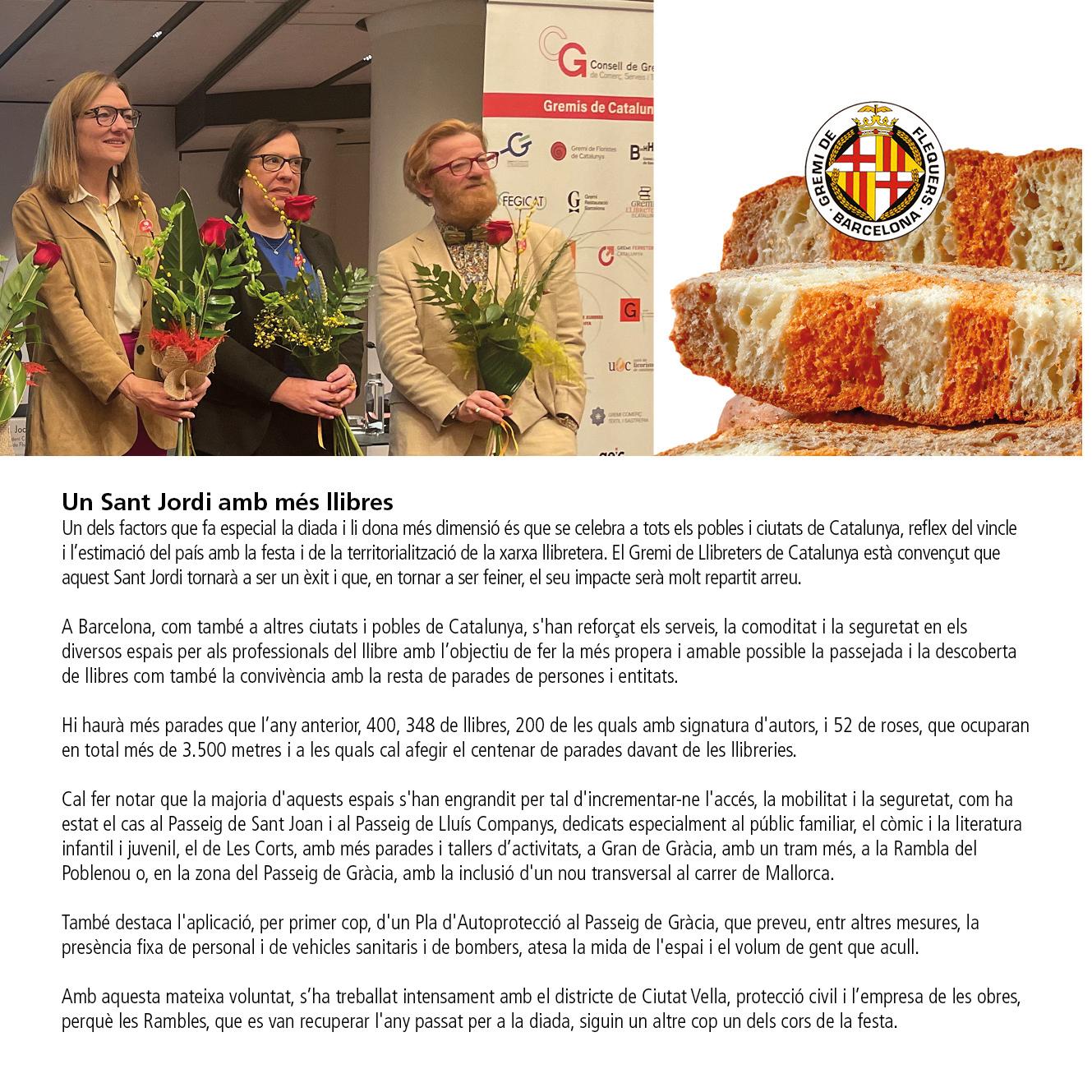 En Jaume Bertran va recalcar l’intrussisme que hi ha en la venda de pa de Sant Jordi, i va recordar que es una marca registrada pel Gremi de Flequers de Barcelona, que té la seva formula d’elaboració, per això la denominació de Pa de Sant Jordi tan sols pot ser utilitzada per aquells estavblimrnt associats al gremi de Flequers de Barcelona o autoritzars per aquest.