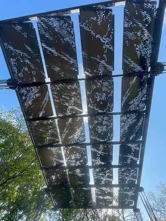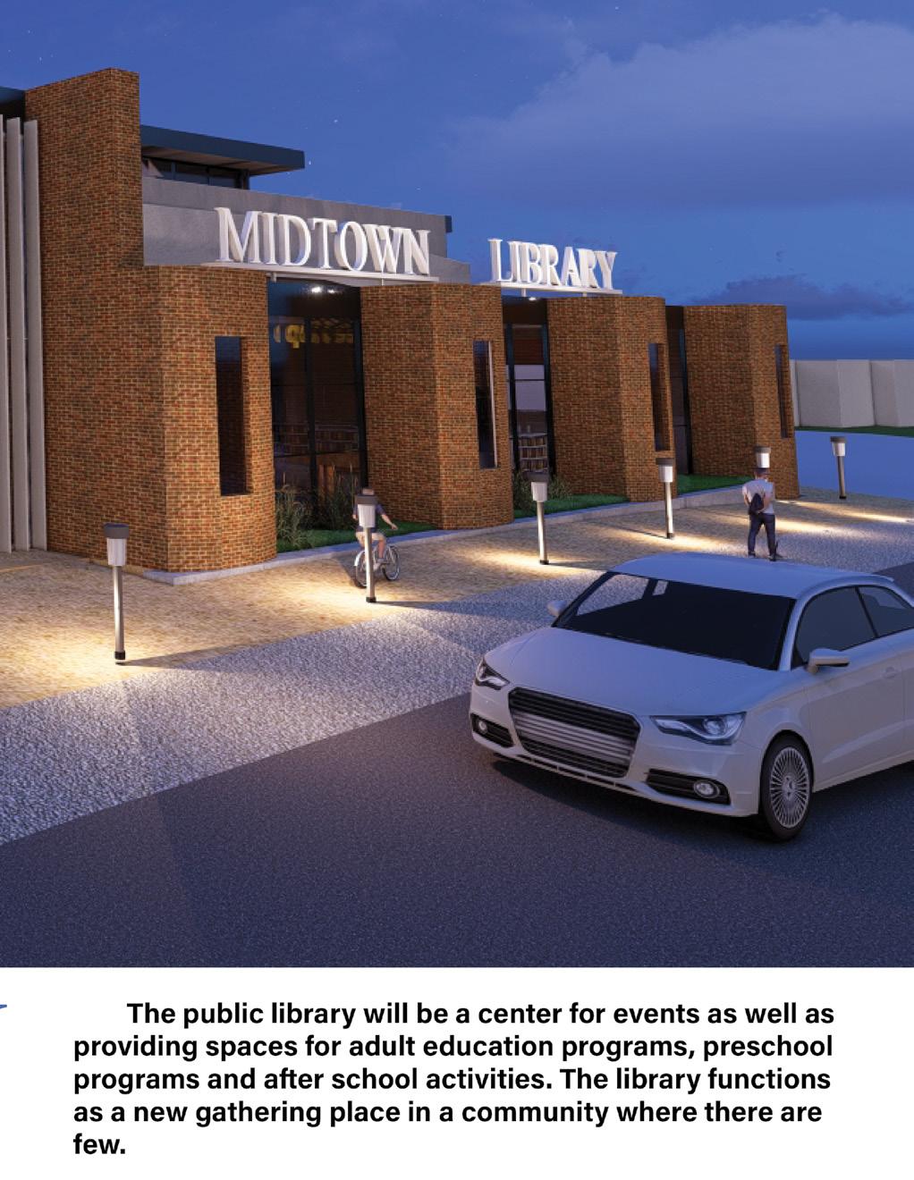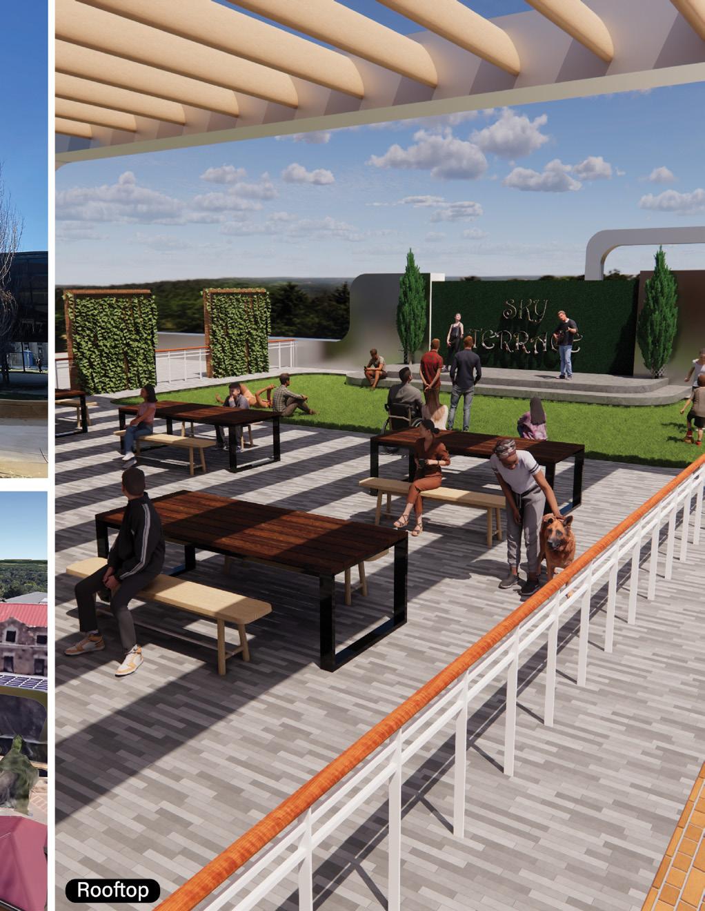 The lawn is the focal point of the site with the capability to host community events or casual activities. There are many ways to use the space with a tiered landscape and a berm both gentle and steep sloped. The sloped lawn can become an informal ampitheater.