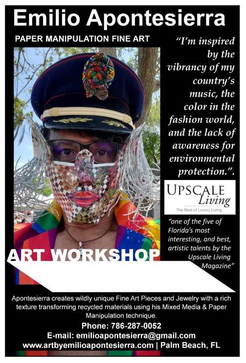 “Emilio Apontesierra Paretti is a South American artist — born in Valledullar, Colombia — who brought his love of the arts when he moved to South Florida in 2002 seeking political asylum. Since then he has focused his time on creating art, writing poetry, and his public speaking career. Apontesierra-Parreti’s visual work is created using three mediums Paper Manipulation Fine Art – Ink on Canvas – Manipulated Photography — and his poetry is composed wholly in Spanish.
